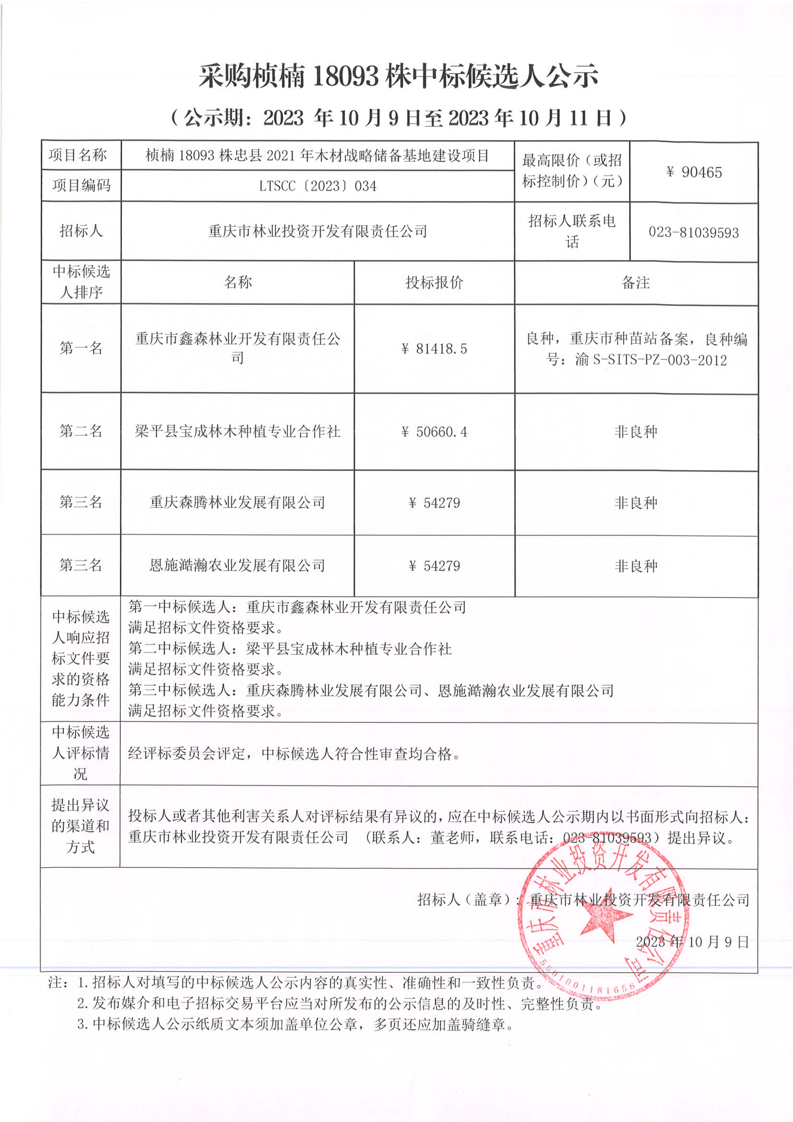 中标候选人公示:桢楠18093株忠县2021年木材战略储备基地建设项目