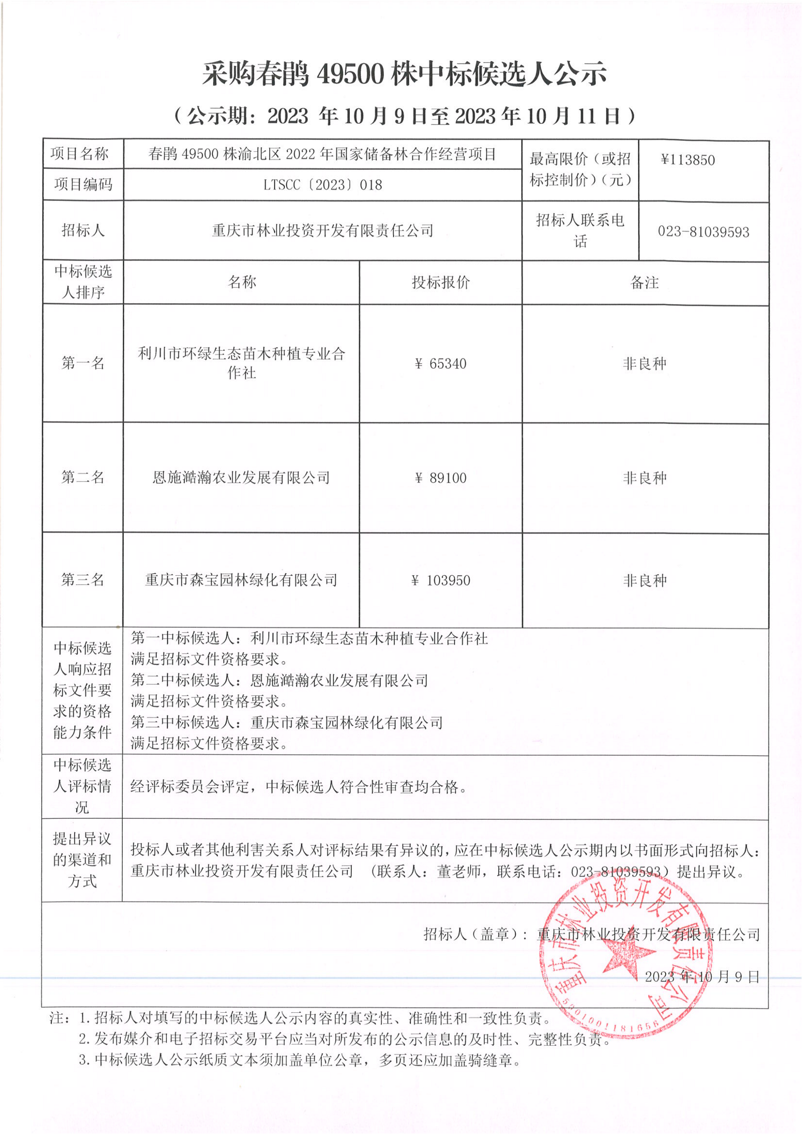 中标候选人公示:春鹃49500株渝北区2022年国家储备林合作经营项目