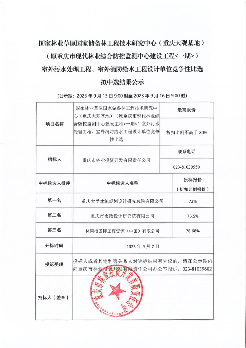 国家林业草原国家储备林工程技术研究中心(重庆大观基地)(原重庆市现代林业综合防控监测中心建设工程<一期>)室外污水处理工程、室外消防给水工程设计单位竞争性比选 拟中选结果公示