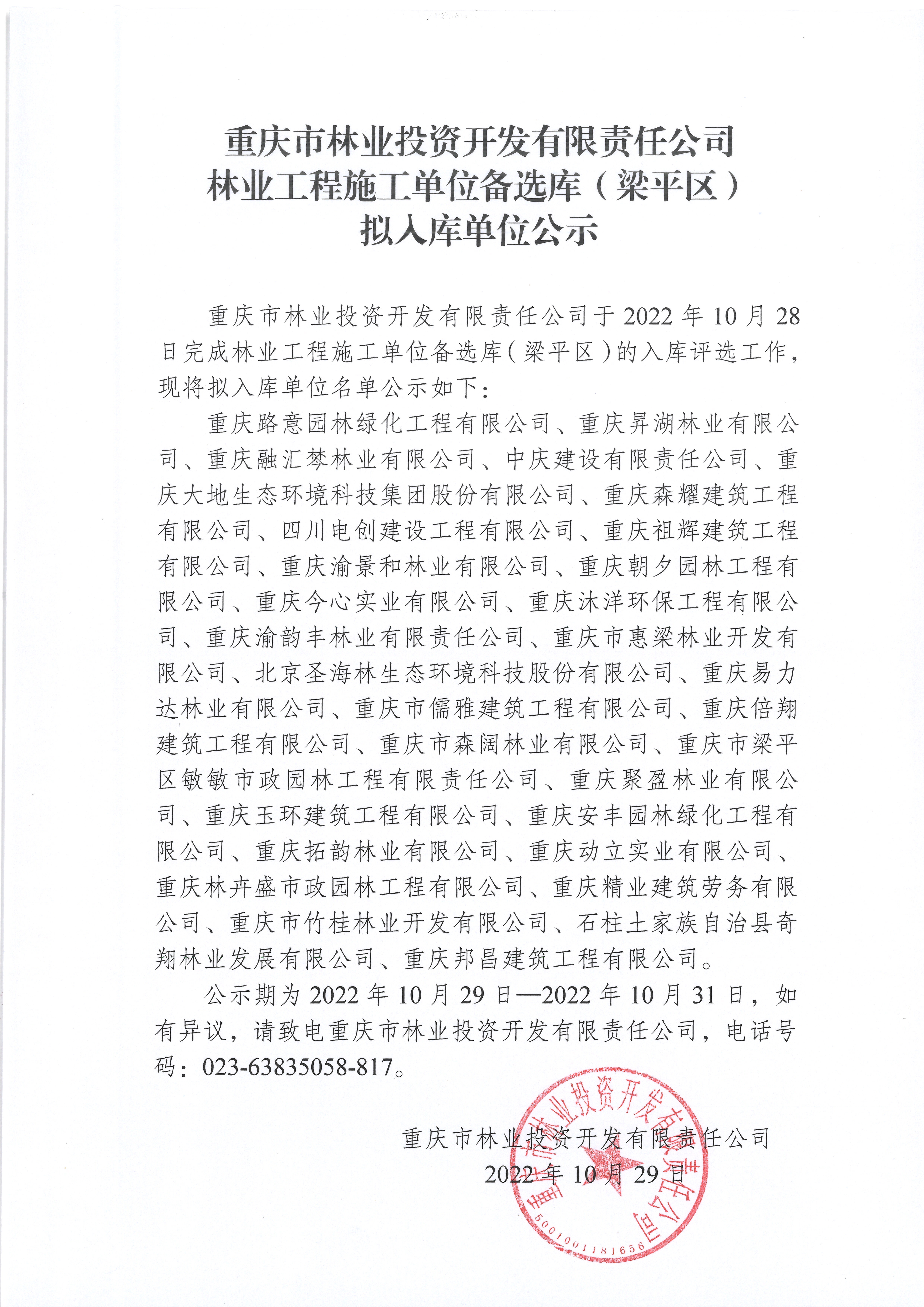 林业工程施工单位备选库(梁平区)拟入库单位公示