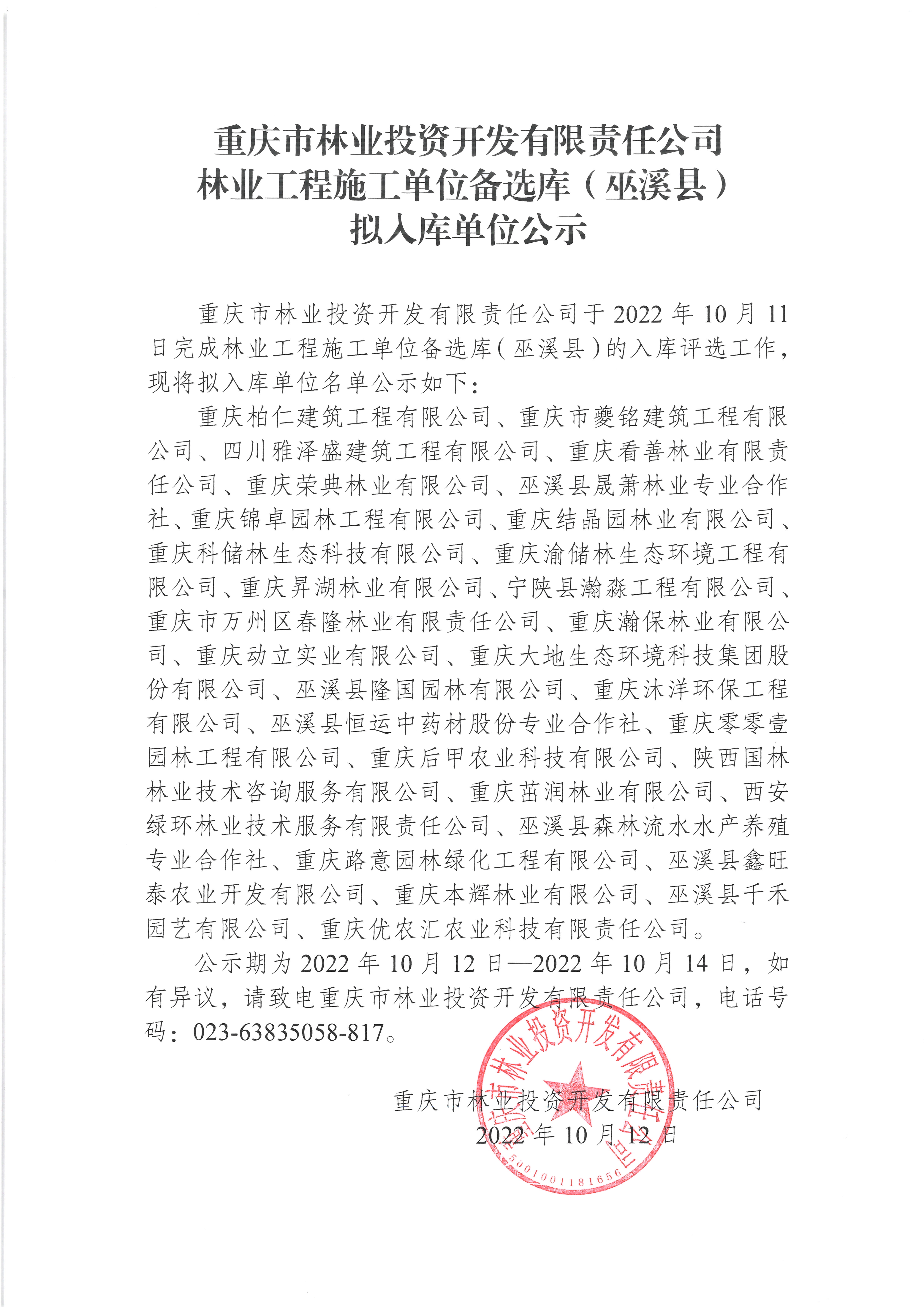林业工程施工单位备选库(巫溪县)拟入库单位公示