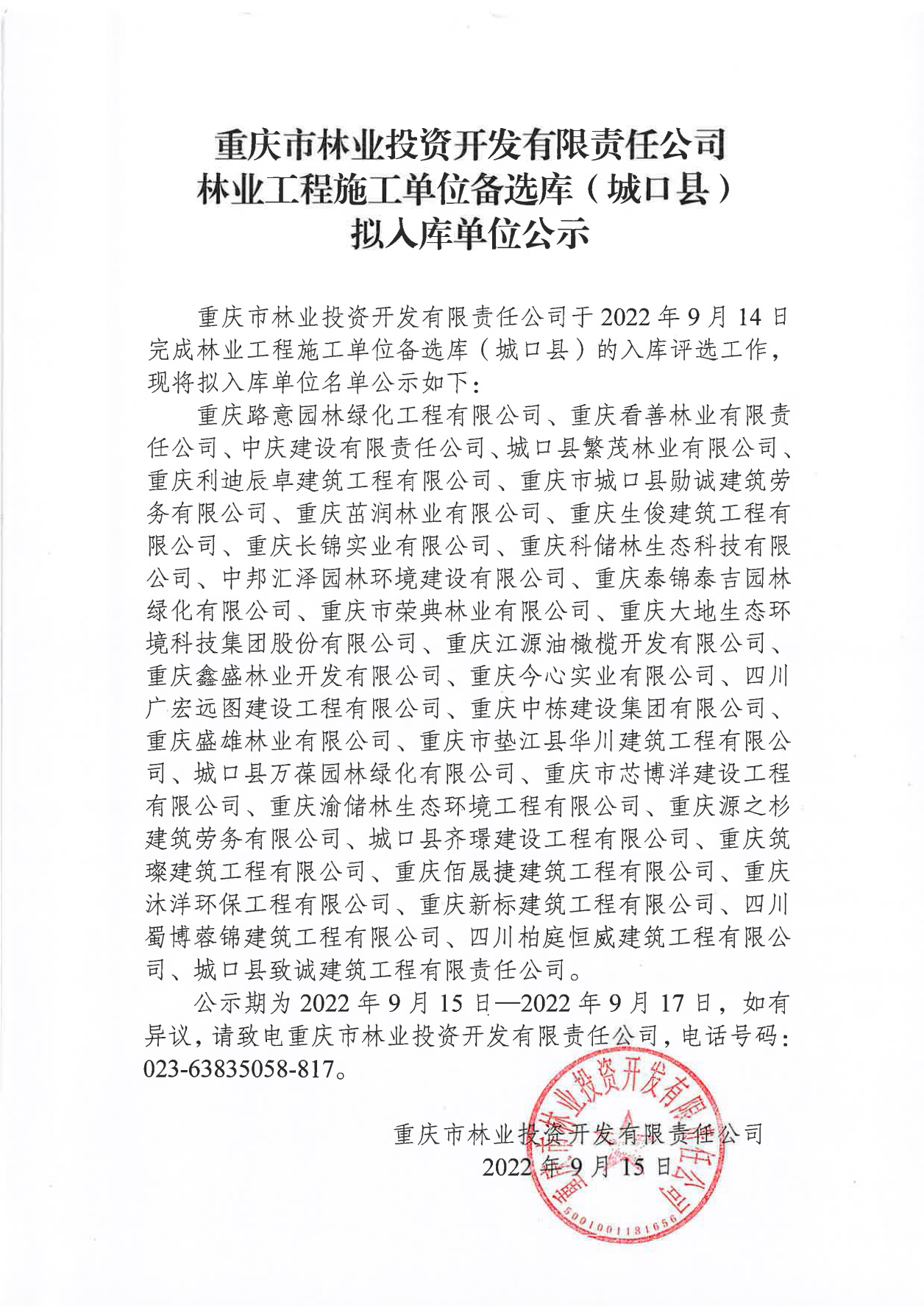 重庆市林业投资开发有限责任公司林业工程施工单位备选库(城口县)拟入库单位公示