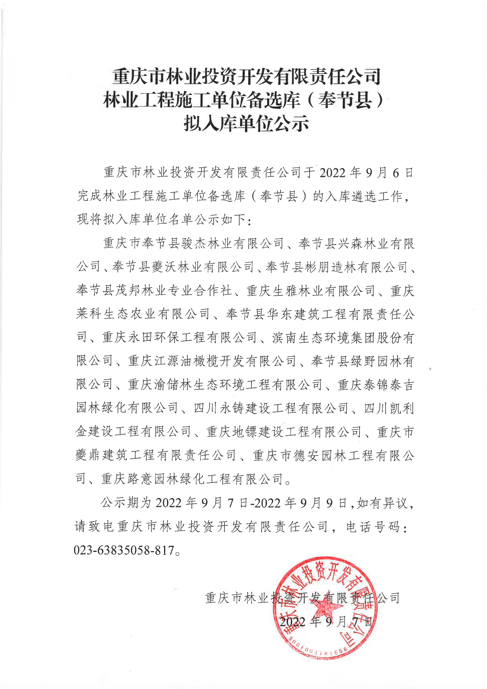 重庆市林业投资开发有限责任公司林业工程施工单位备选库(奉节县)拟入库单位公示