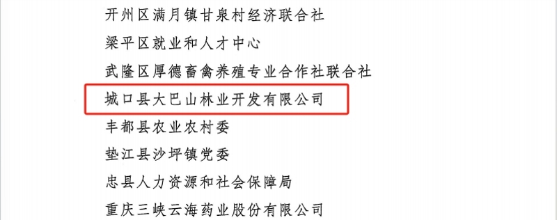重庆市委、市政府在《关于表彰重庆市乡村振兴贡献奖 先进集体和先进个人的决定》中,共授予了50个集体“重庆市乡村振兴贡献奖先进集体”称号和100名个人“重庆市乡村振兴贡献奖先进个人”称号,以表彰他们“以热爱乡村的深厚情怀、建设乡村的昂扬斗志、振兴乡村的使命担当,扎实推进农业全面升级、农村全面进步、农民全面发展,为重庆经济社会持续健康发展作出了重要贡献”。大巴山林开公司光荣上榜“重庆市乡村振兴贡献奖先进集体”。