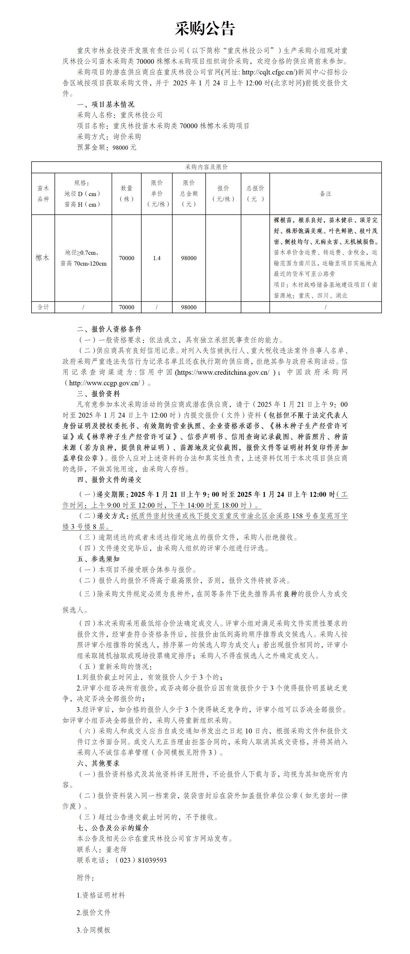 重庆林投苗木采购类70000株檫木采购项目采购公告
