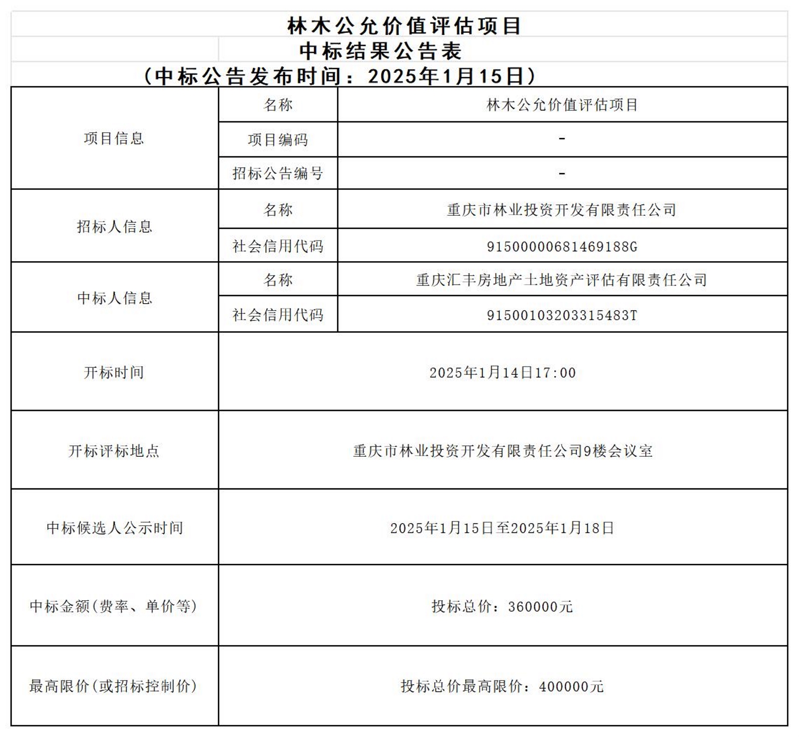 重庆林投公司林木公允价值评估项目中标结果公告表