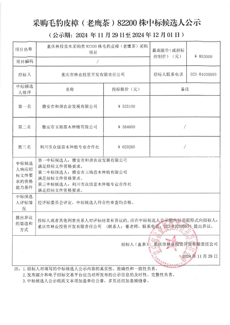 重庆林投苗木采购类82200株毛豹皮樟(老鹰茶)采购项目中标候选人公示