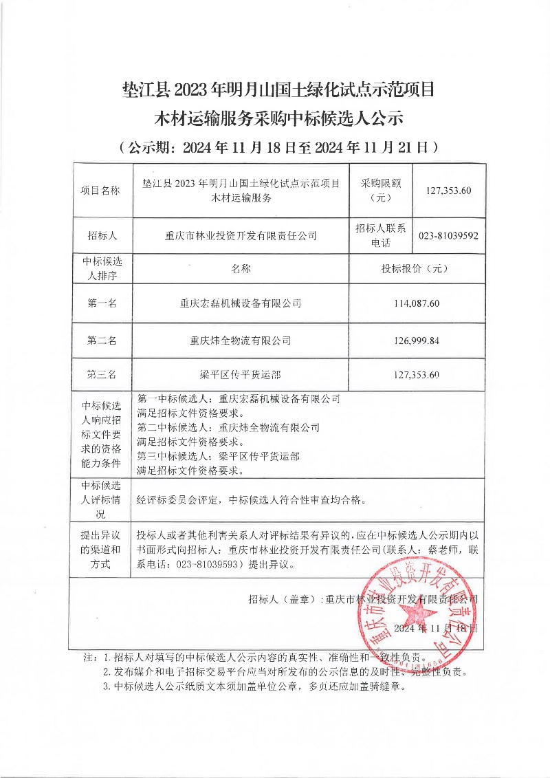 垫江县2023年明月山国土绿化试点示范项目木材运输服务采购中标候选人公示
