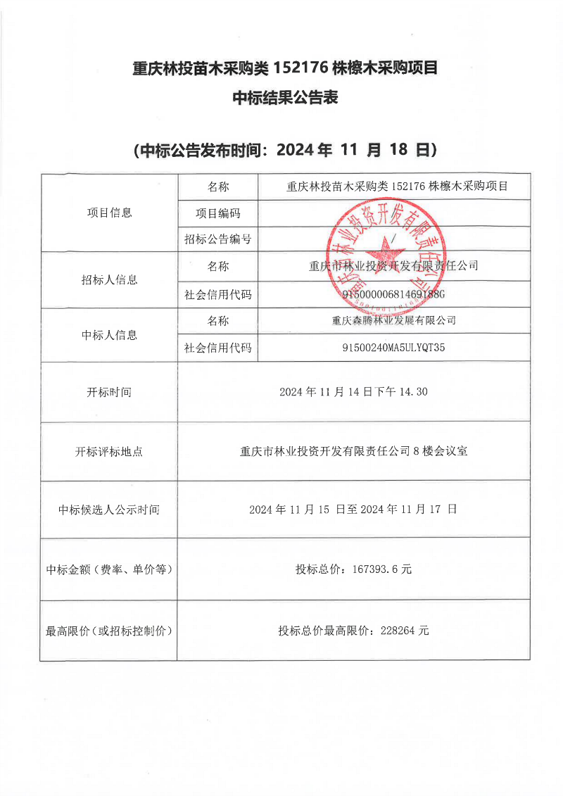 重庆林投苗木采购类152176株檫木采购项目中标结果公告