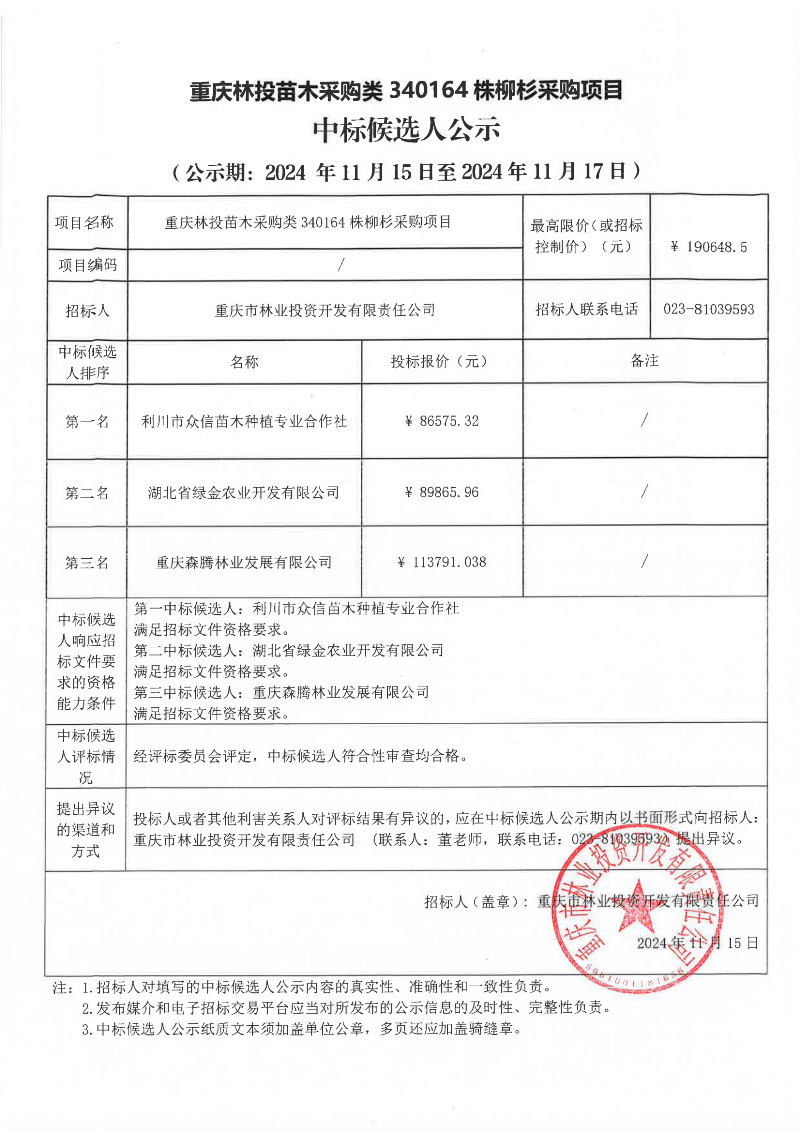 重庆林投苗木采购类340164株柳杉采购项目中标候选人公示