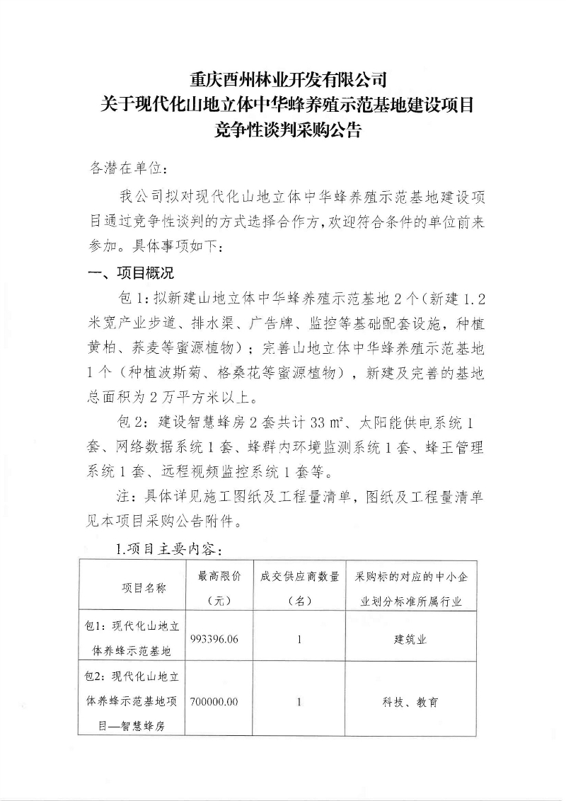 重庆酉州林业开发有限公司关于现代化山地立体中华蜂养殖示范基地建设项目竞争性谈判采购公告