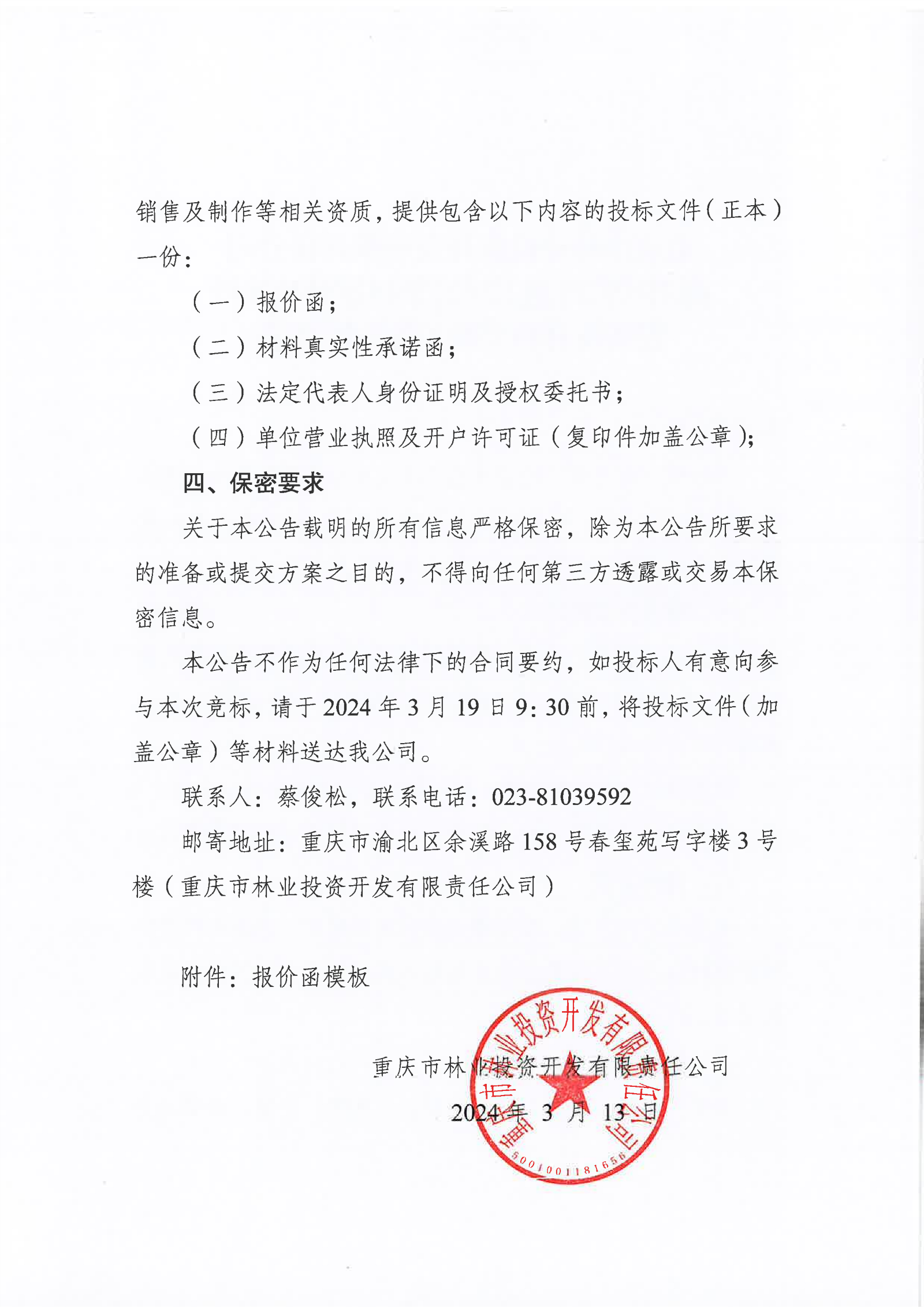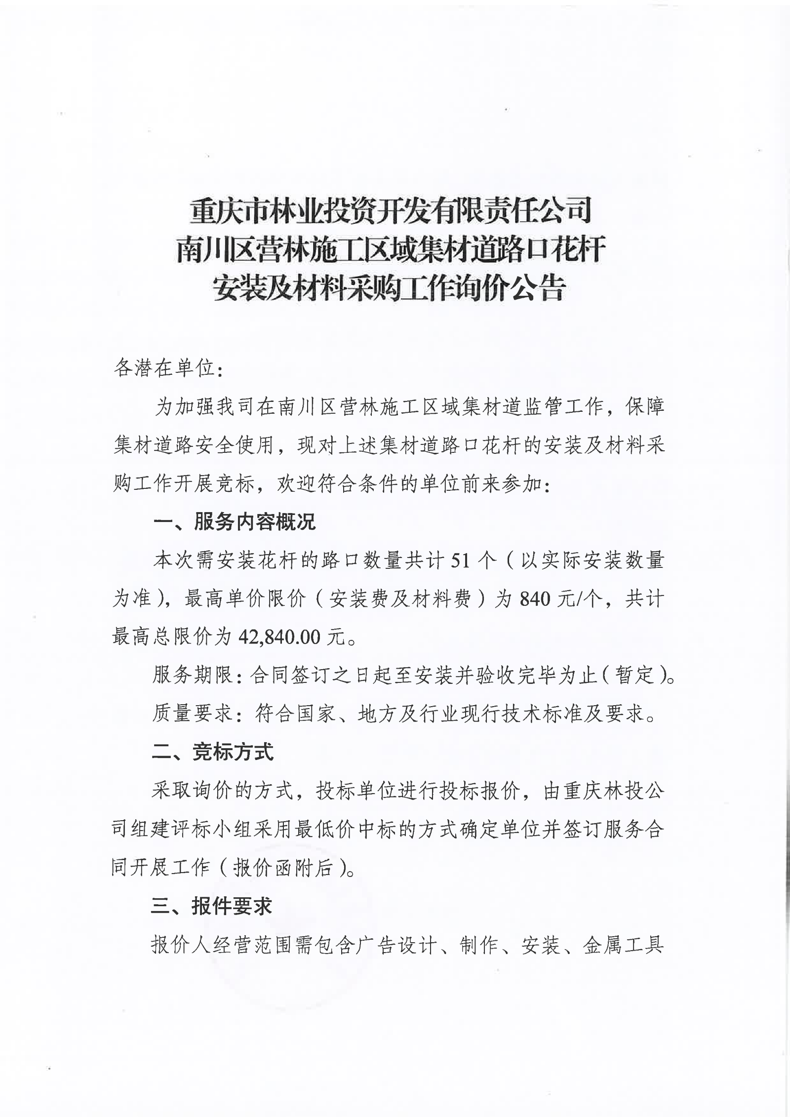 南川区营林施工区域集材道路口花杆安装及材料采购工作询价公告