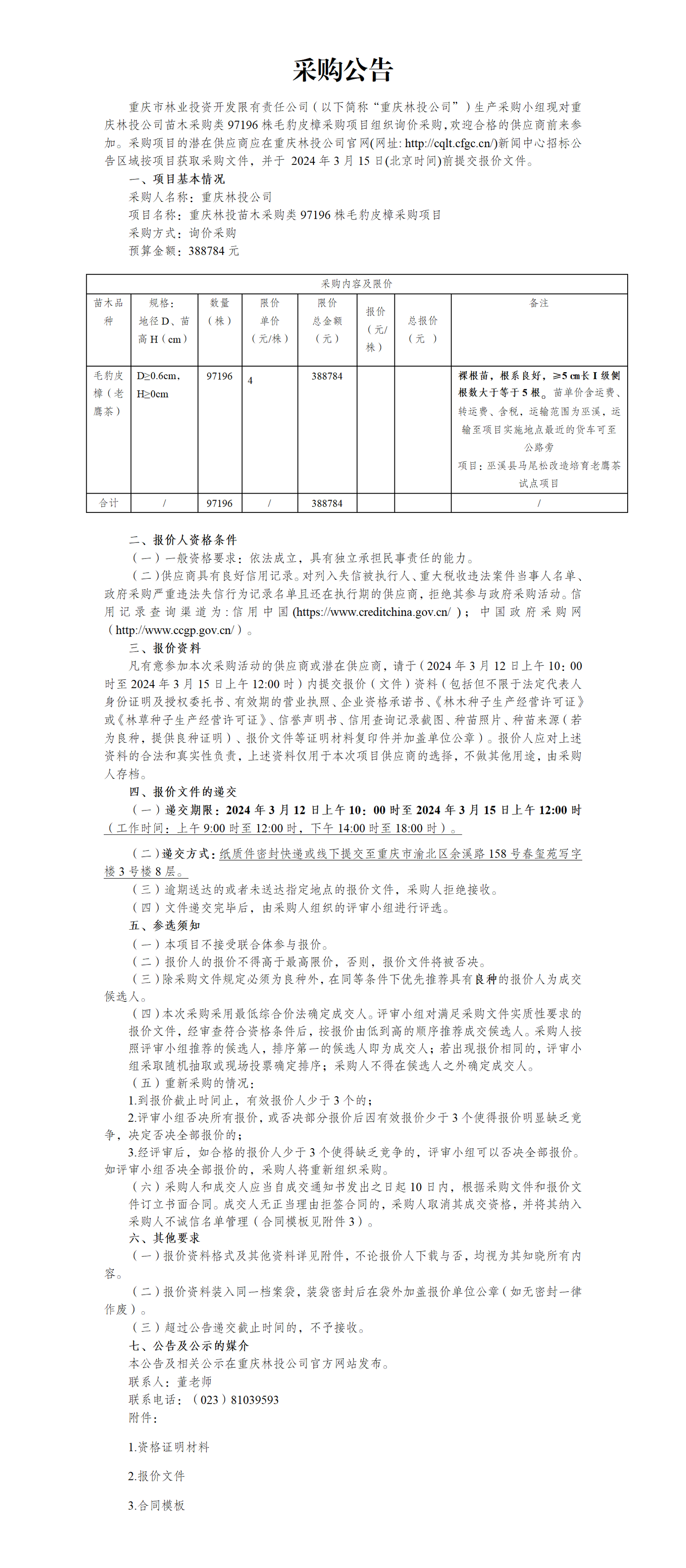 重庆林投公司苗木采购类97196株毛豹皮樟采购项目