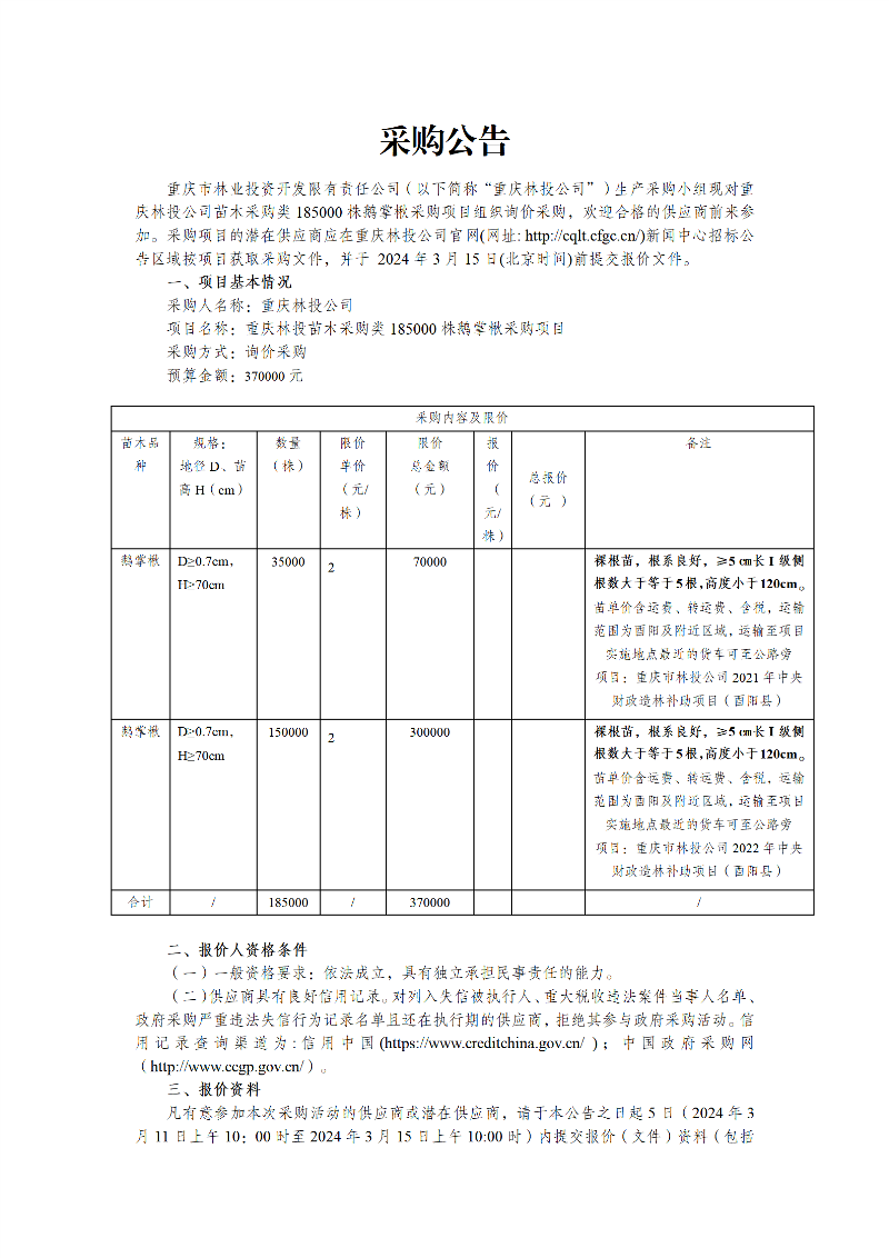 重庆林投公司苗木采购类185000株鹅掌楸采购项目