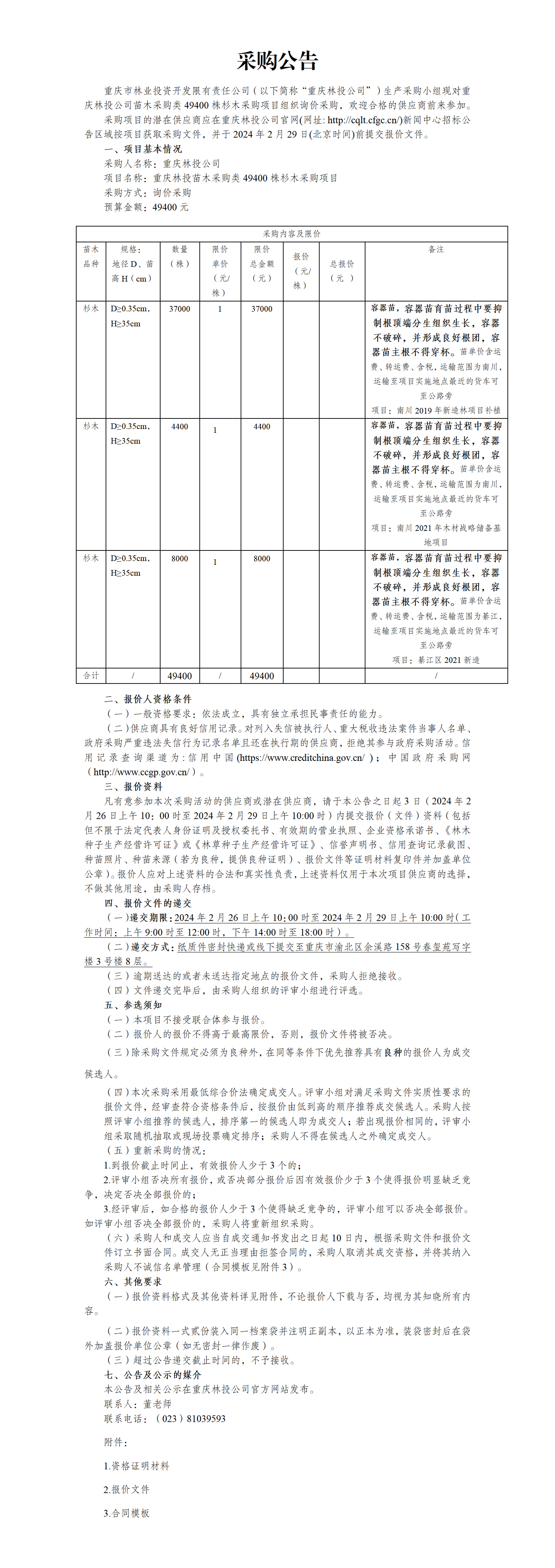 重庆林投公司苗木采购类49400株杉木采购项目组织询价采购
