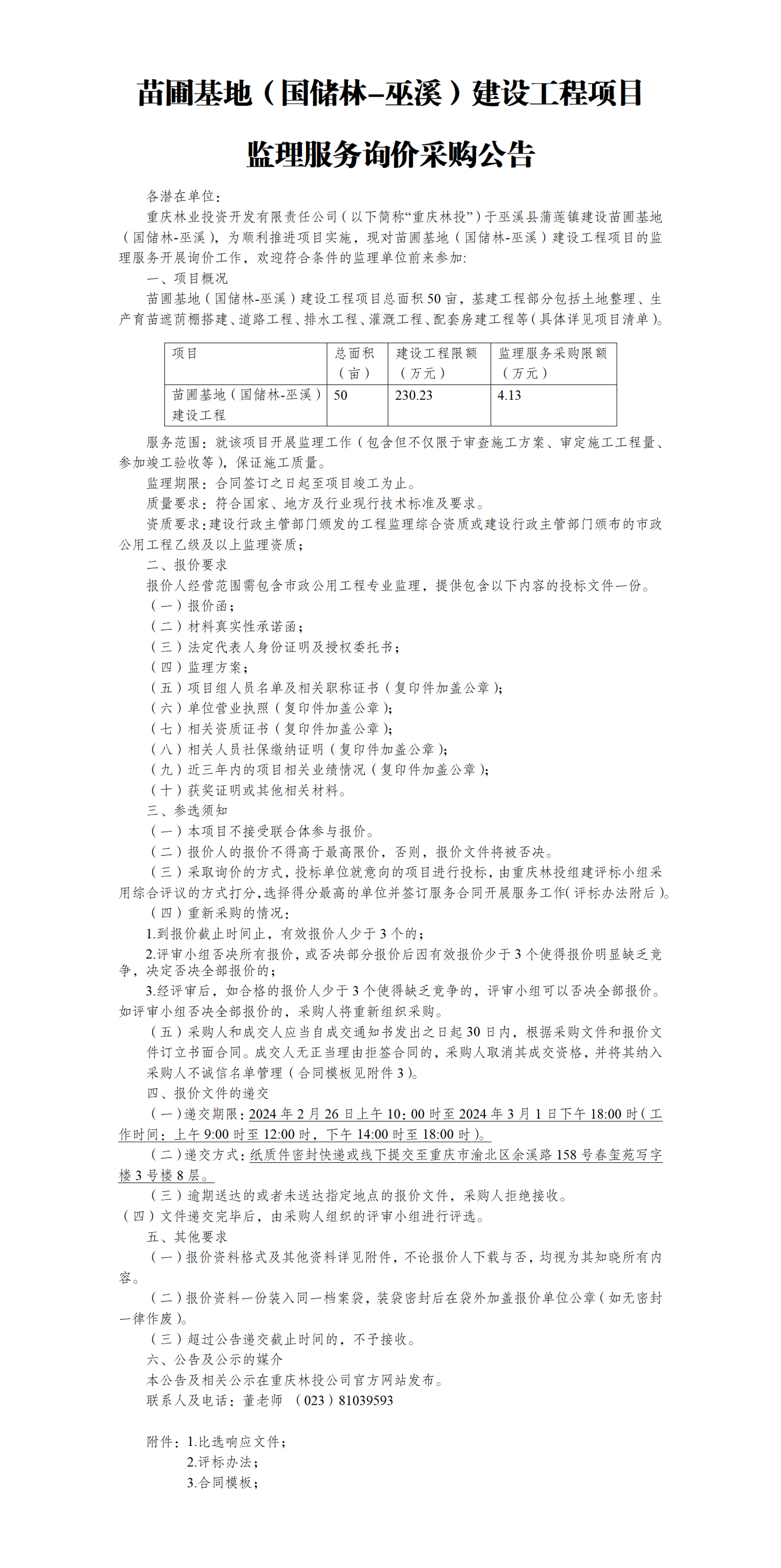 苗圃基地(国储林-巫溪)建设工程项目监理服务询价采购公告