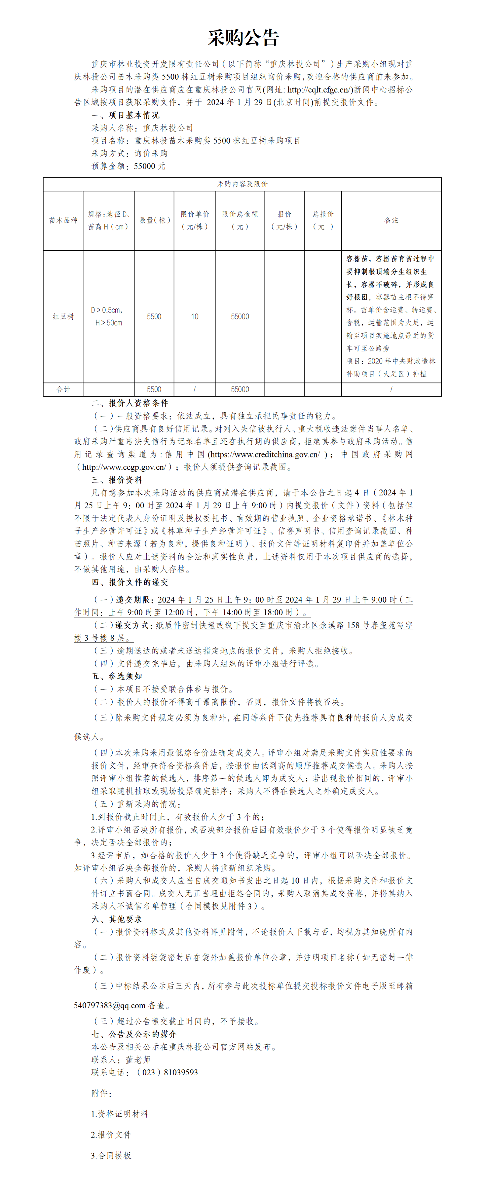 采购公告:重庆林投公司苗木采购类5500株红豆树采购项目
