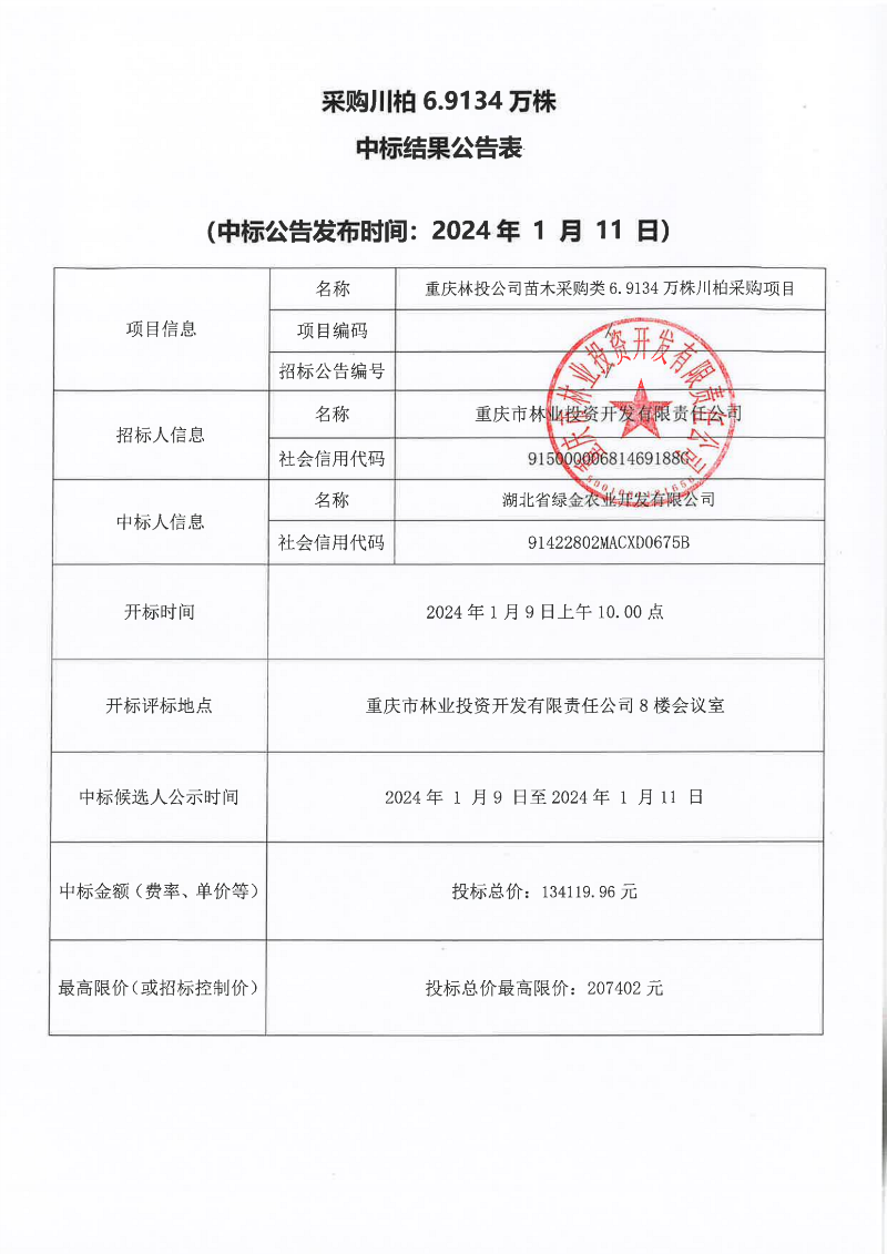 中标结果公告:重庆林投公司苗木采购类6.9134万株川柏采购项目