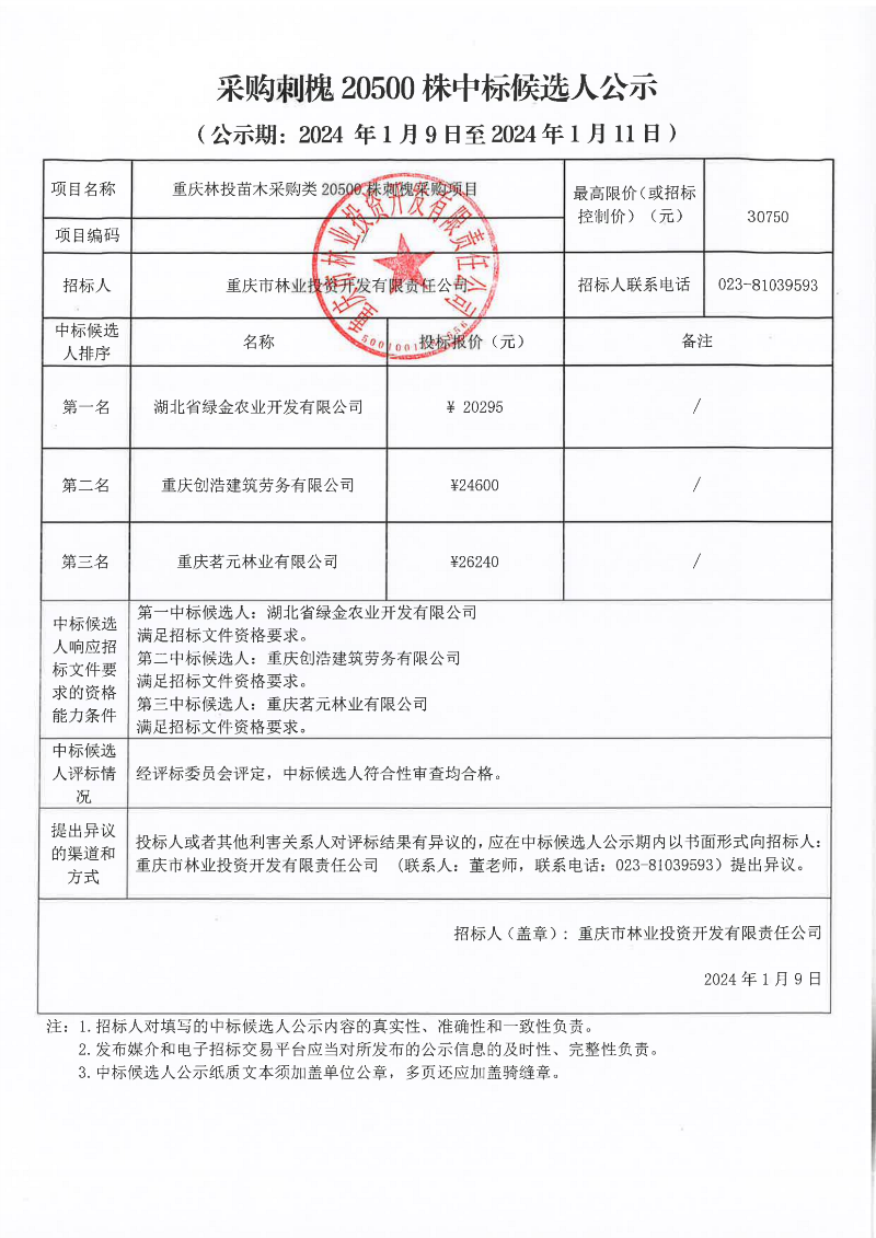 中标候选人公示:重庆林投苗木采购类20500株刺槐采购项目