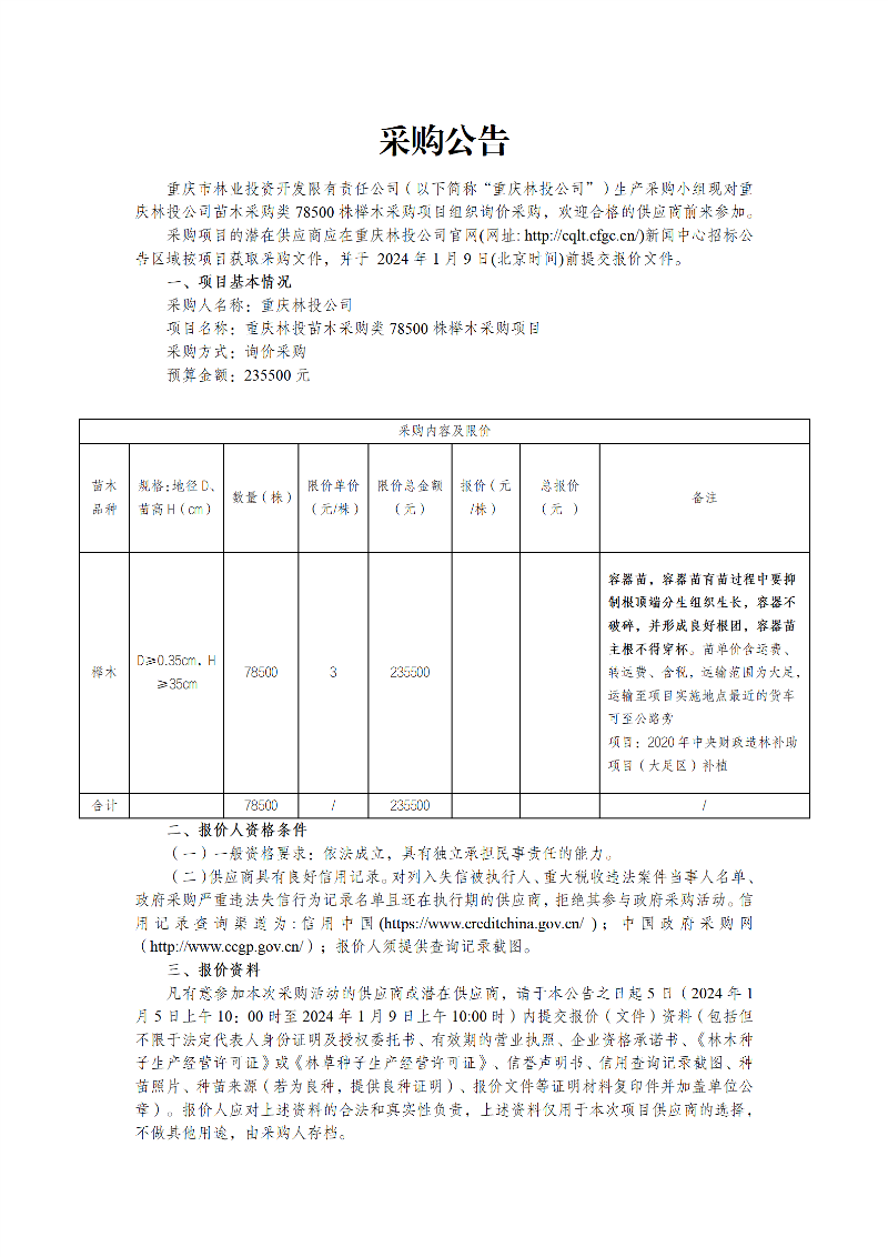 采购公告:重庆林投公司苗木采购类78500株榉木采购项目
