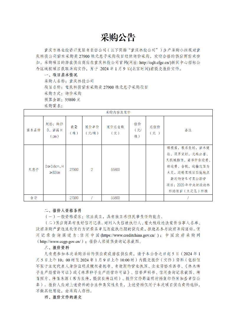 采购公告:重庆林投公司苗木采购类27900株无患子采购项目