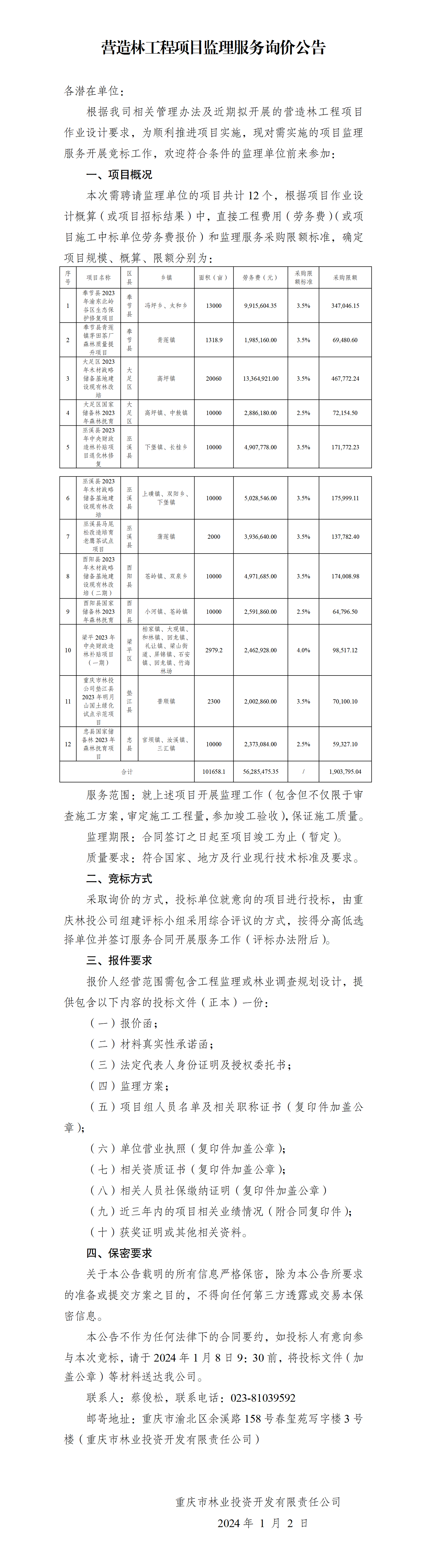 营造林工程项目监理服务询价公告