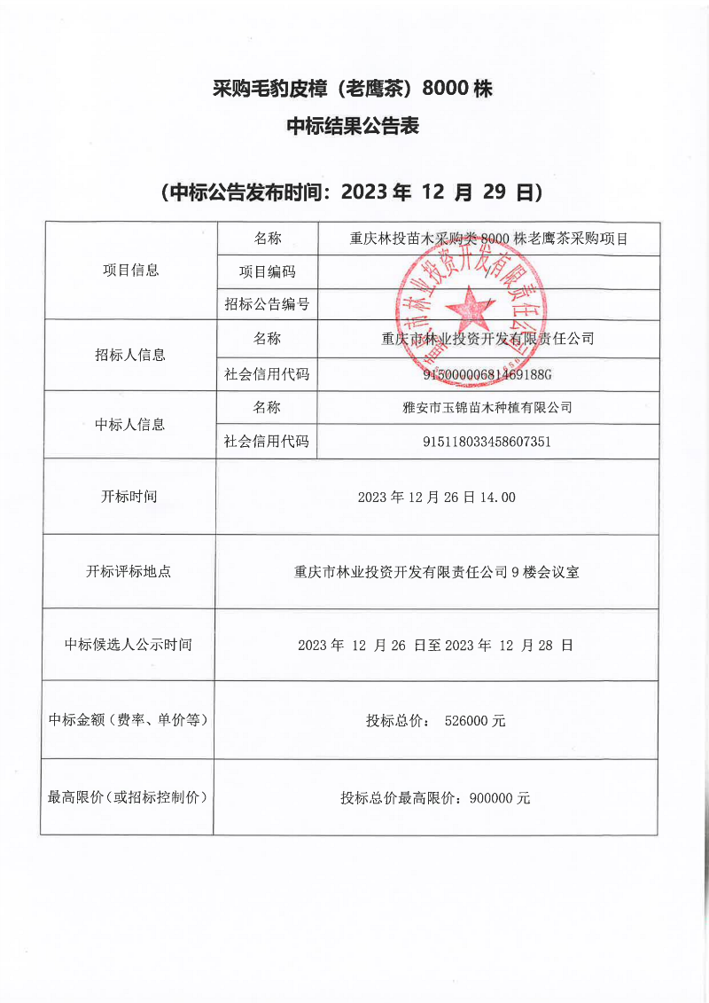 中标结果公告:重庆林投苗木采购类8000株毛豹皮樟(老鹰茶)采购项目