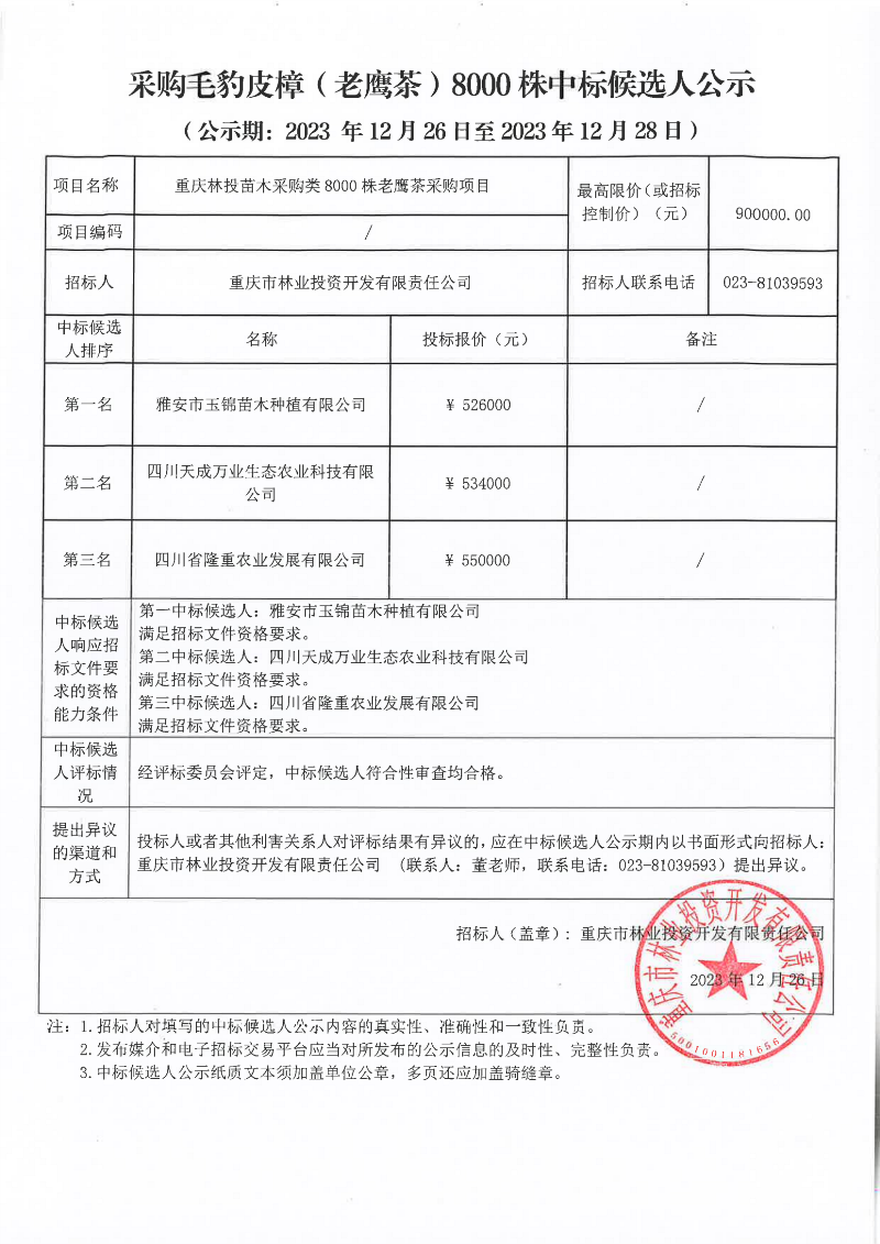 采购毛豹皮樟(老鹰茶)8000株中标候选人公示