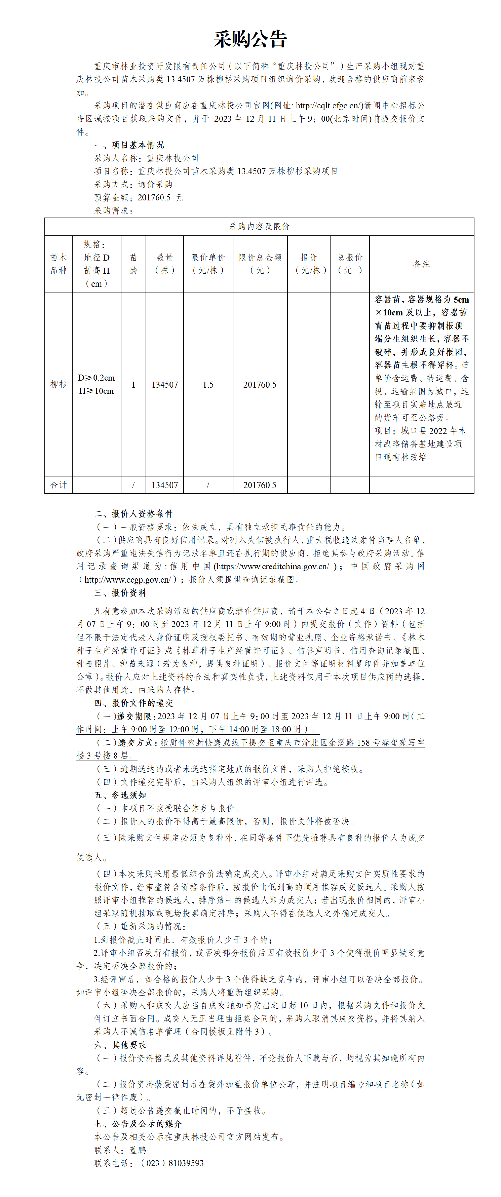 采购公告:重庆林投公司苗木采购类13.4507万株柳杉采购项目