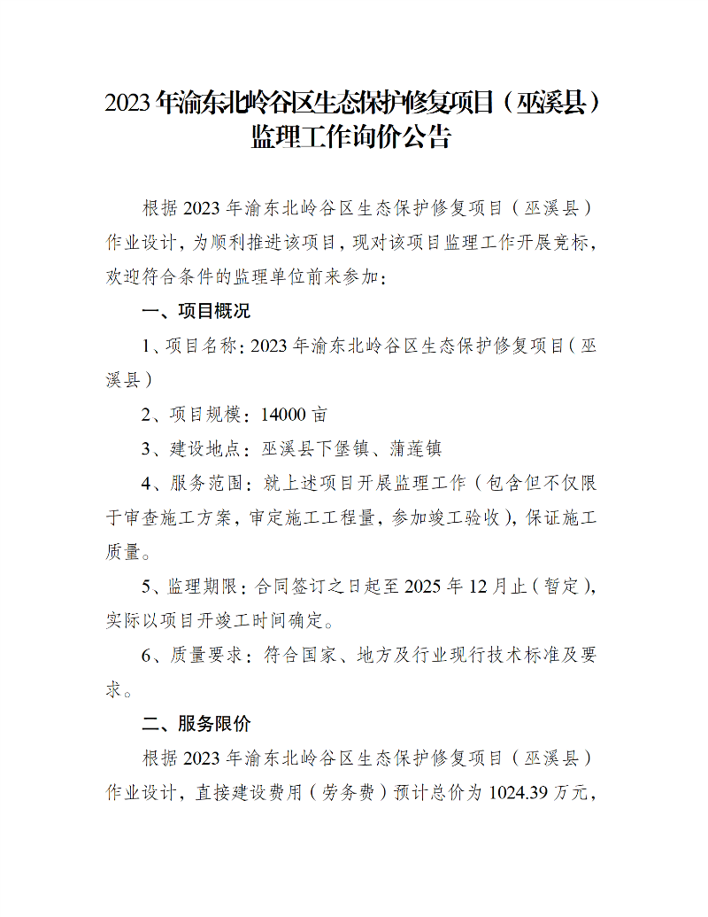2023年渝东北岭谷区生态保护修复项目(巫溪县)监理工作询价公告