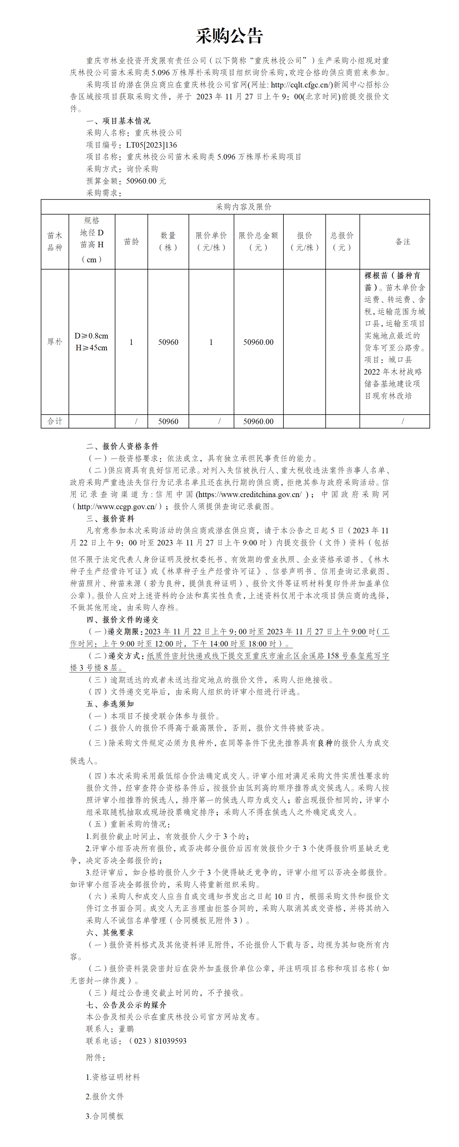 采购公告重庆林投公司苗木采购类5.096万株厚朴采购项目