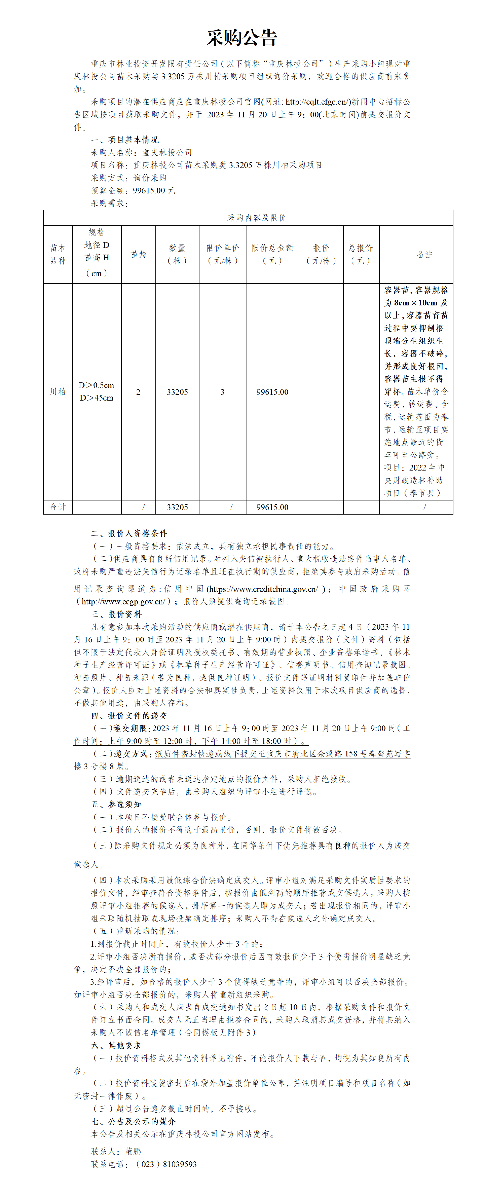 采购公告:重庆林投公司苗木采购类3.3205万株川柏采购项目