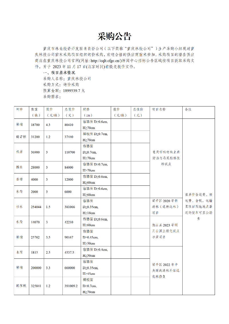 采购公告:重庆林投公司苗木采购项目