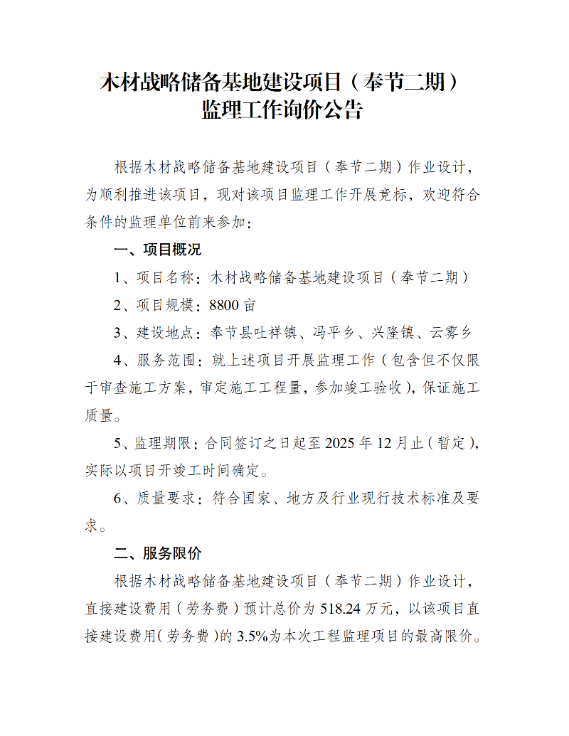 木材战略储备基地建设项目(奉节二期)监理工作询价公告