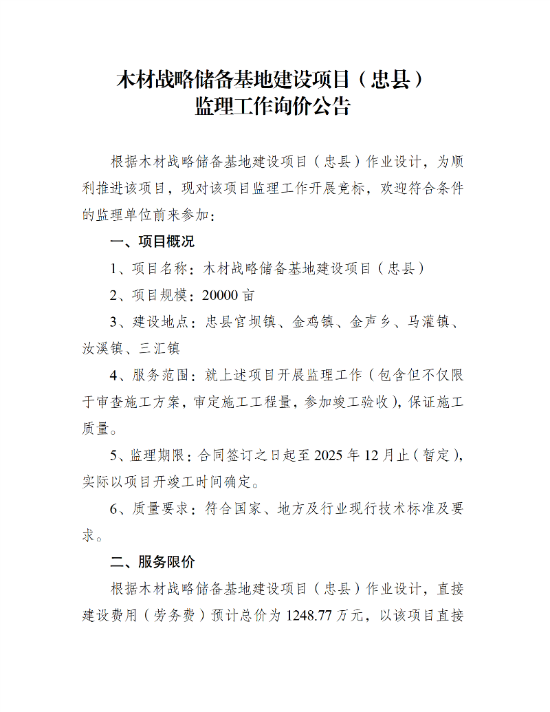 木材战略储备基地建设项目(忠县)监理工作询价公告