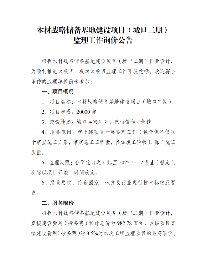 木材战略储备基地建设项目(城口二期)监理工作询价公告