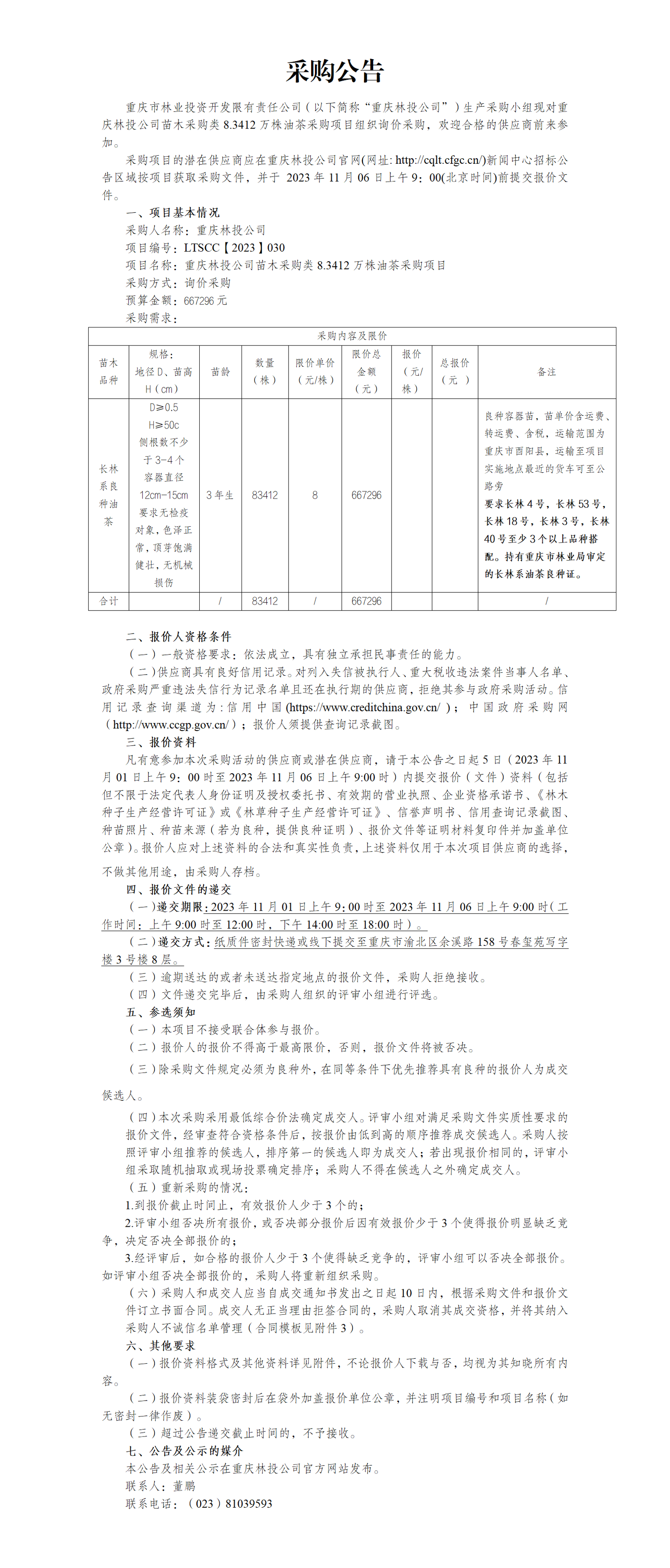 8.3412万株油茶采购项目组织询价采购公告