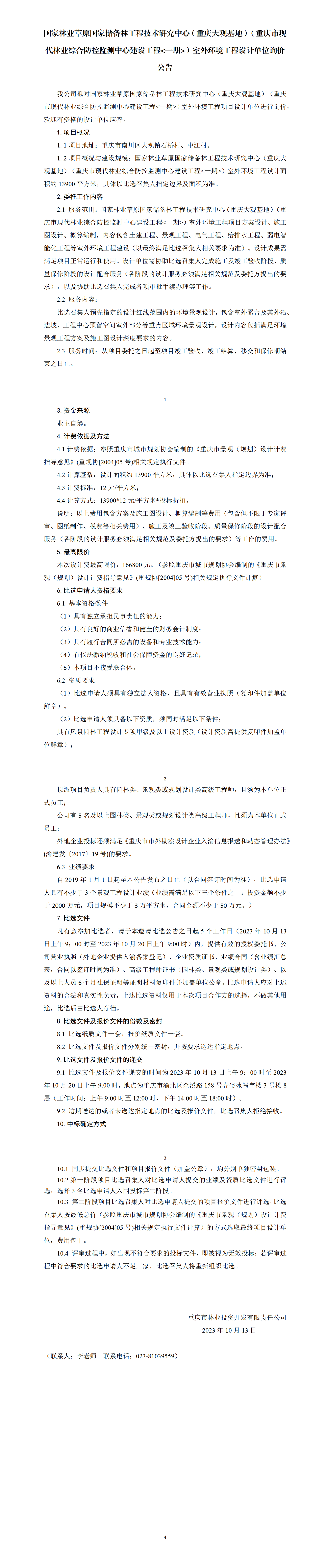 询价公告:国家林业草原国家储备林工程技术研究中心(重庆大观基地)(重庆市现代林业综合防控监测中心建设工程<一期>)室外环境工程设计单位