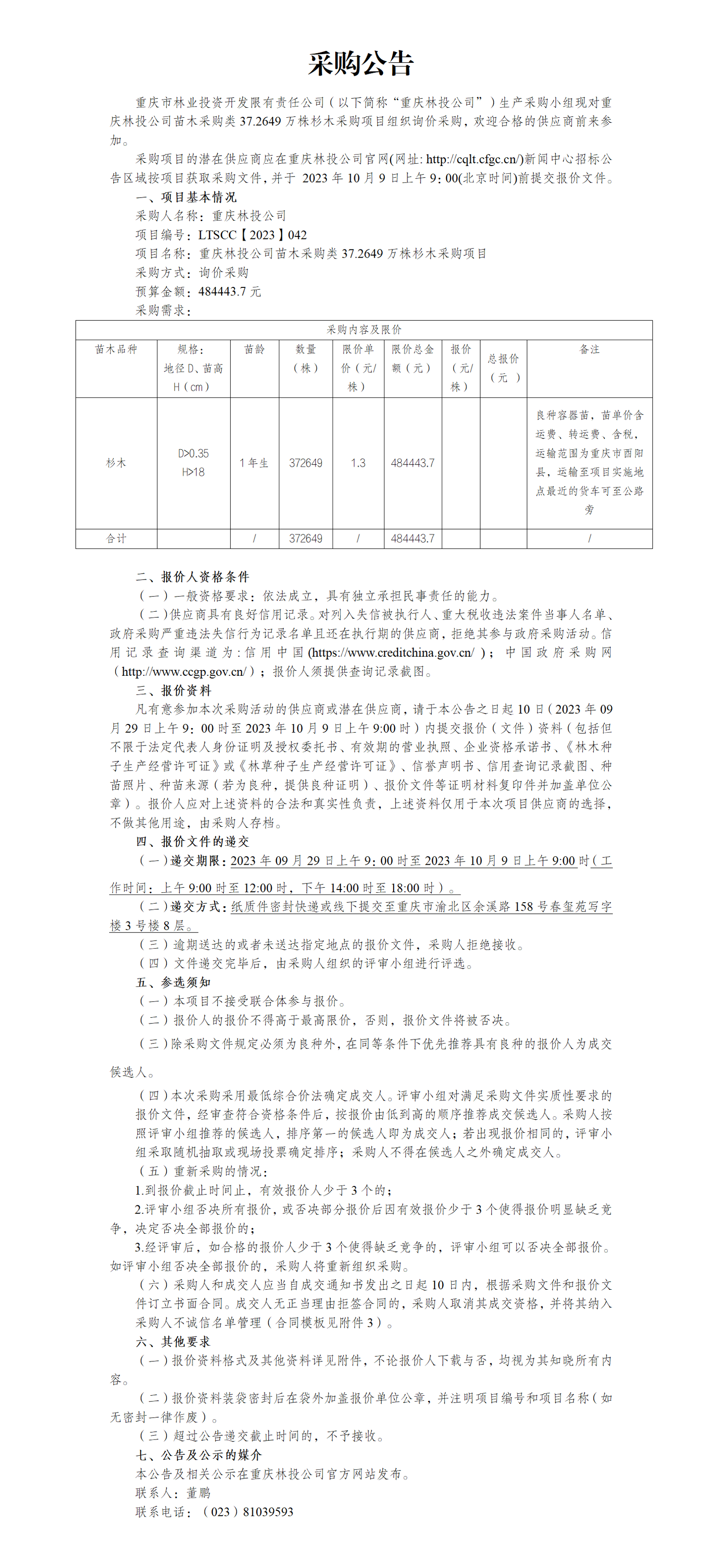 采购公告重庆林投公司苗木采购类37.2649万株杉木采购项目