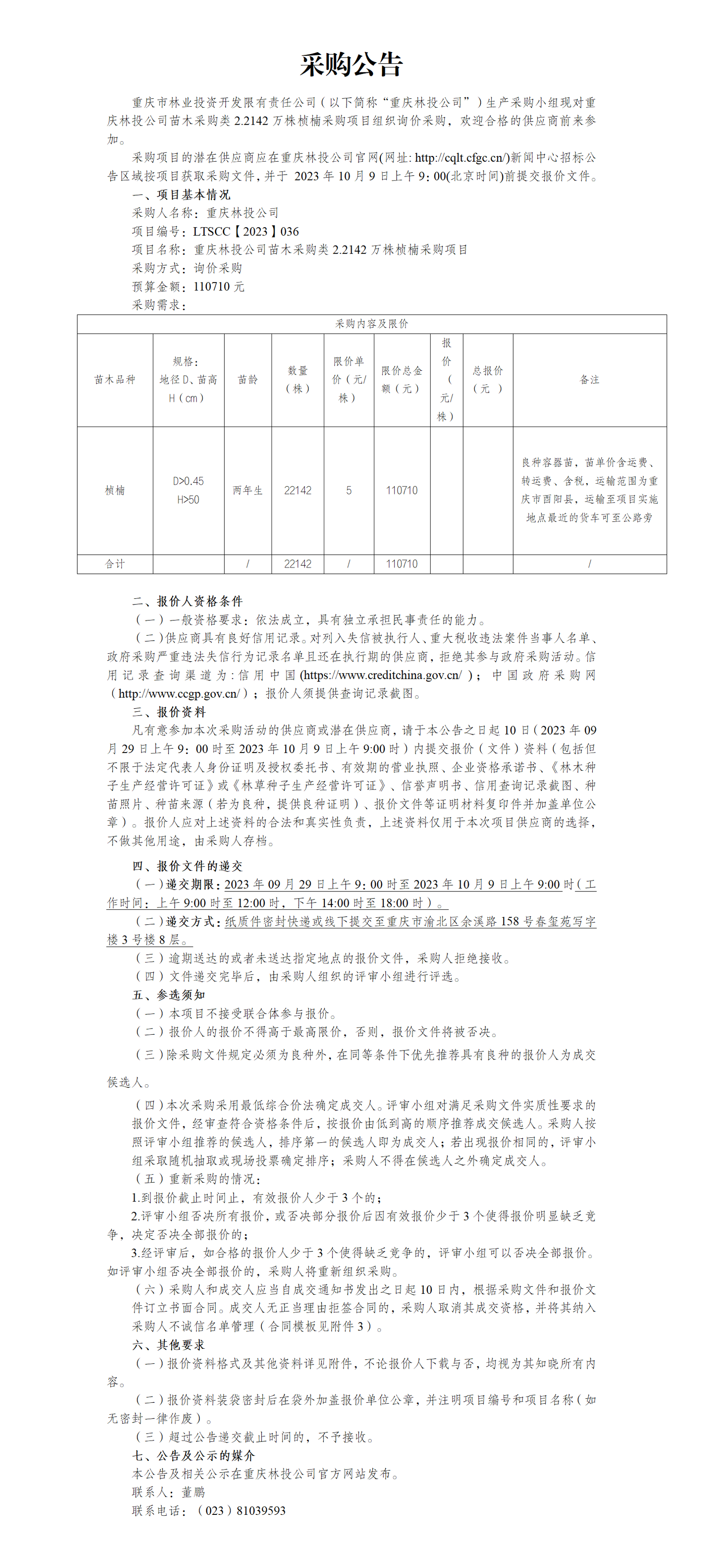 采购公告重庆林投公司苗木采购类2.2142万株桢楠采购项目
