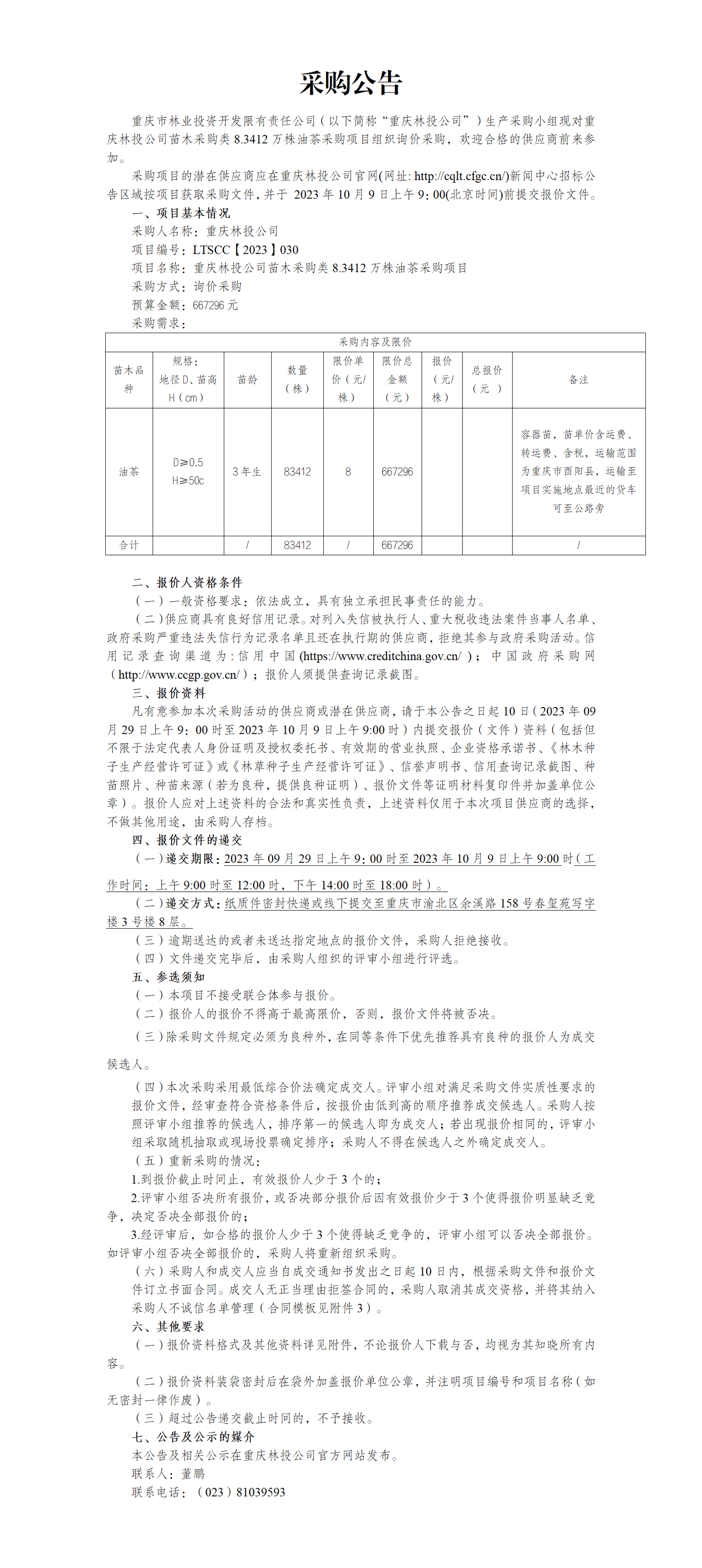 采购公告重庆林投公司苗木采购类8.3412万株油茶采购项目