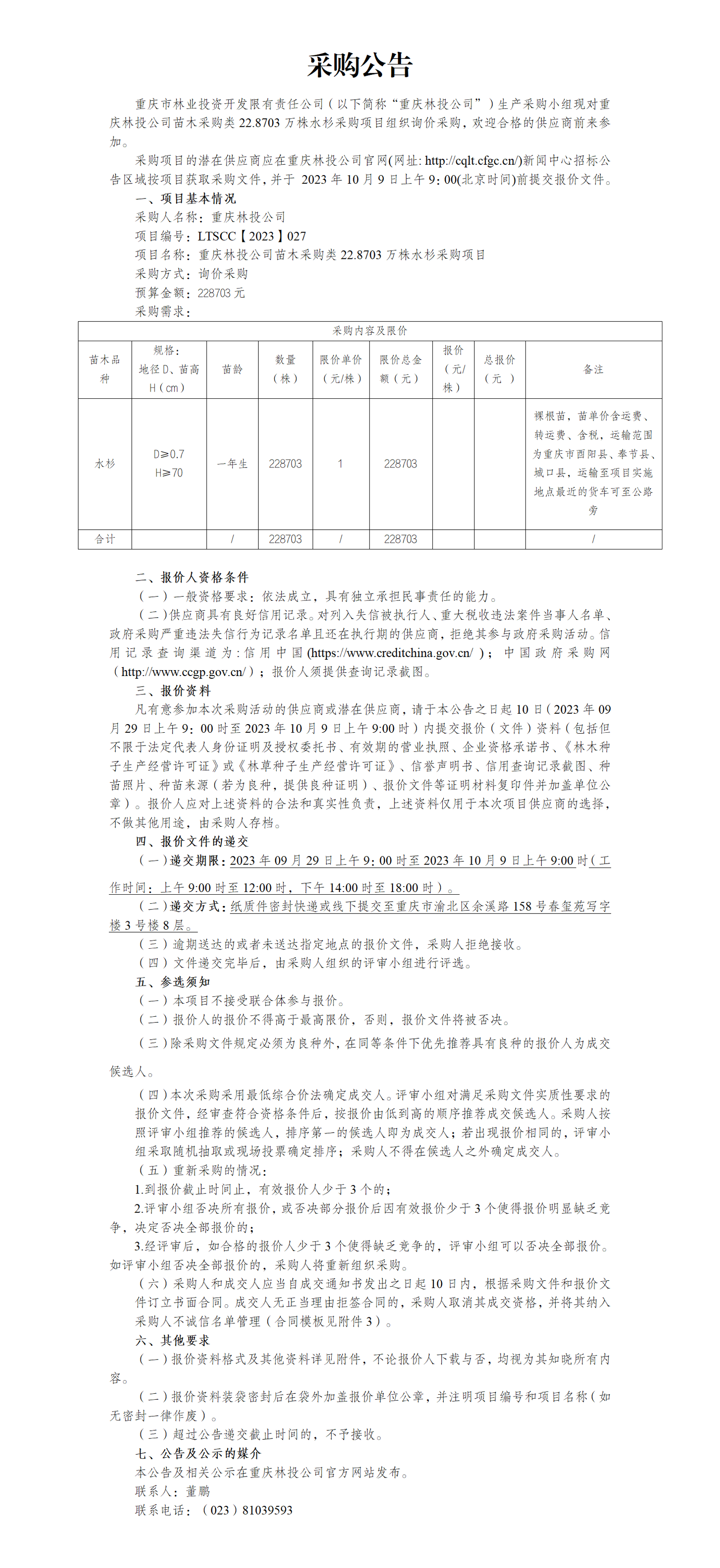 采购公告重庆林投公司苗木采购类22.8703万株水杉采购项目