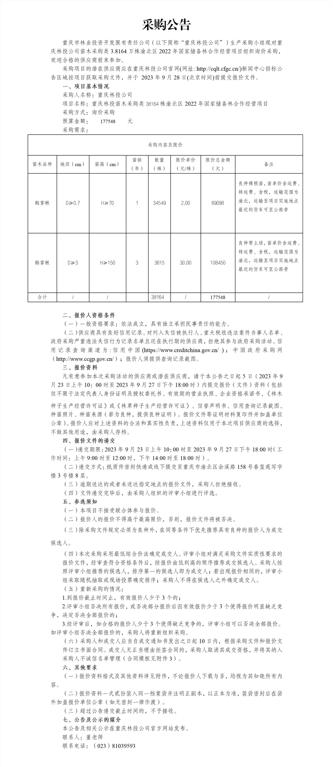 鹅掌楸38164株渝北区2022年国家储备林合作经营项目采购公告