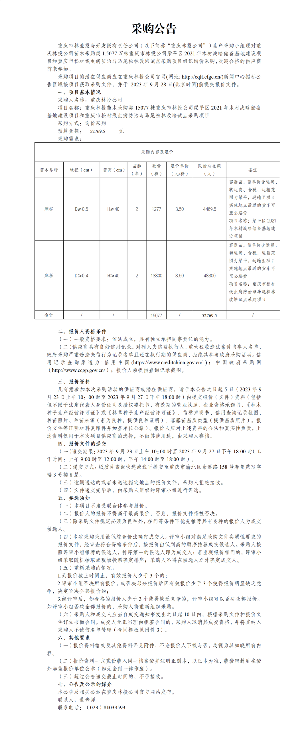 麻栎15077株重庆市林投公司梁平区2021年木材战略储备基地建设项目和重庆市松材线虫病防治与马尾松林改培试点采购项目采购公告