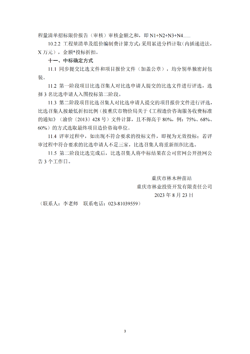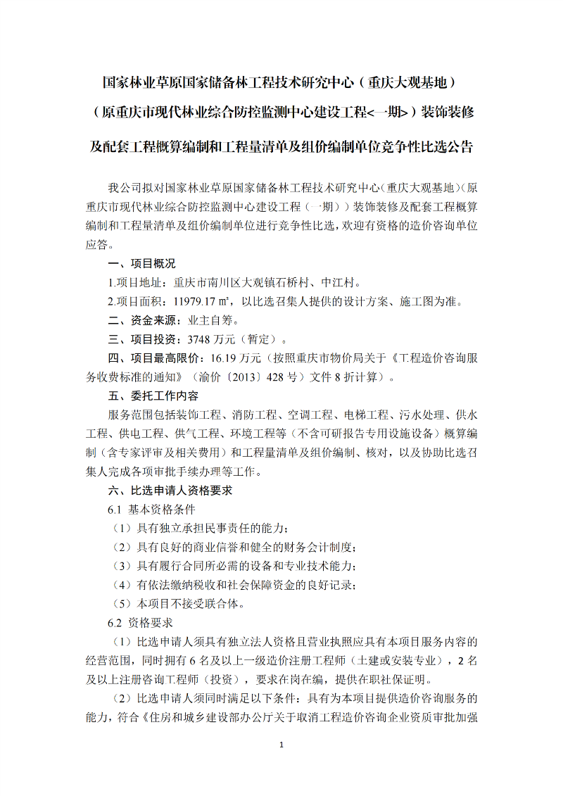 国家林业草原国家储备林工程技术研究中心(重庆大观基地) (原重庆市现代林业综合防控监测中心建设工程<一期> )装饰装修 及配套工程概算编制和工程量清单及组价编制单位竞争性比选公告