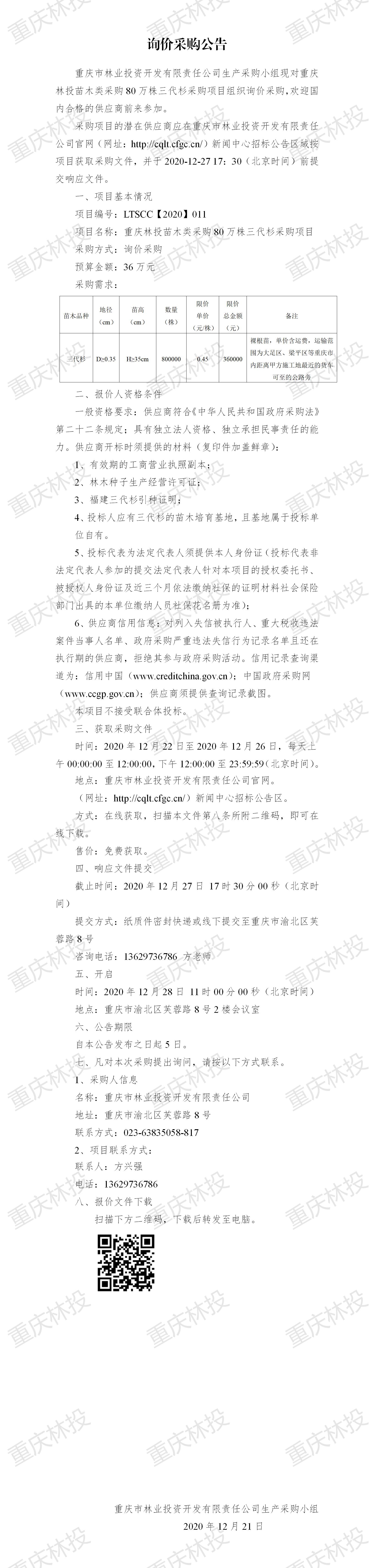 询价采购公告 LTSCC【2020】011 三代杉