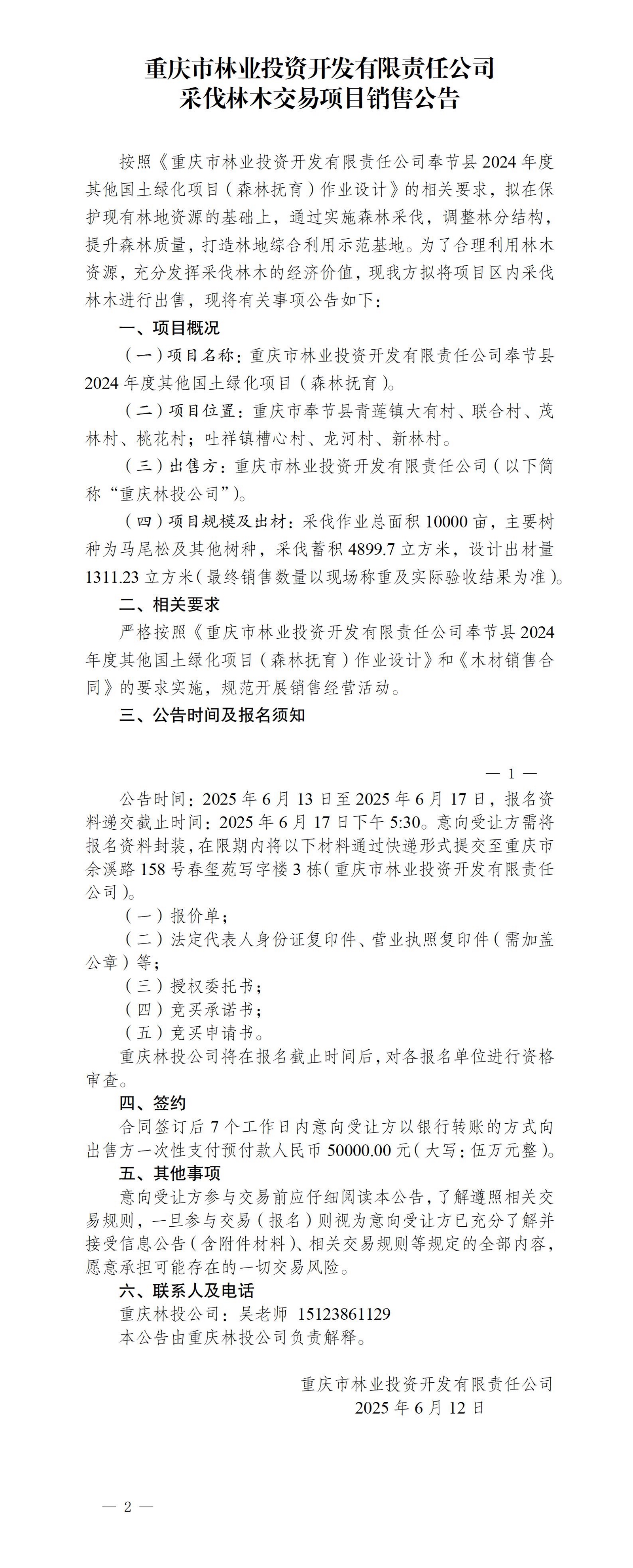 重庆市林业投资开发有限责任公司采伐林木交易项目销售公告