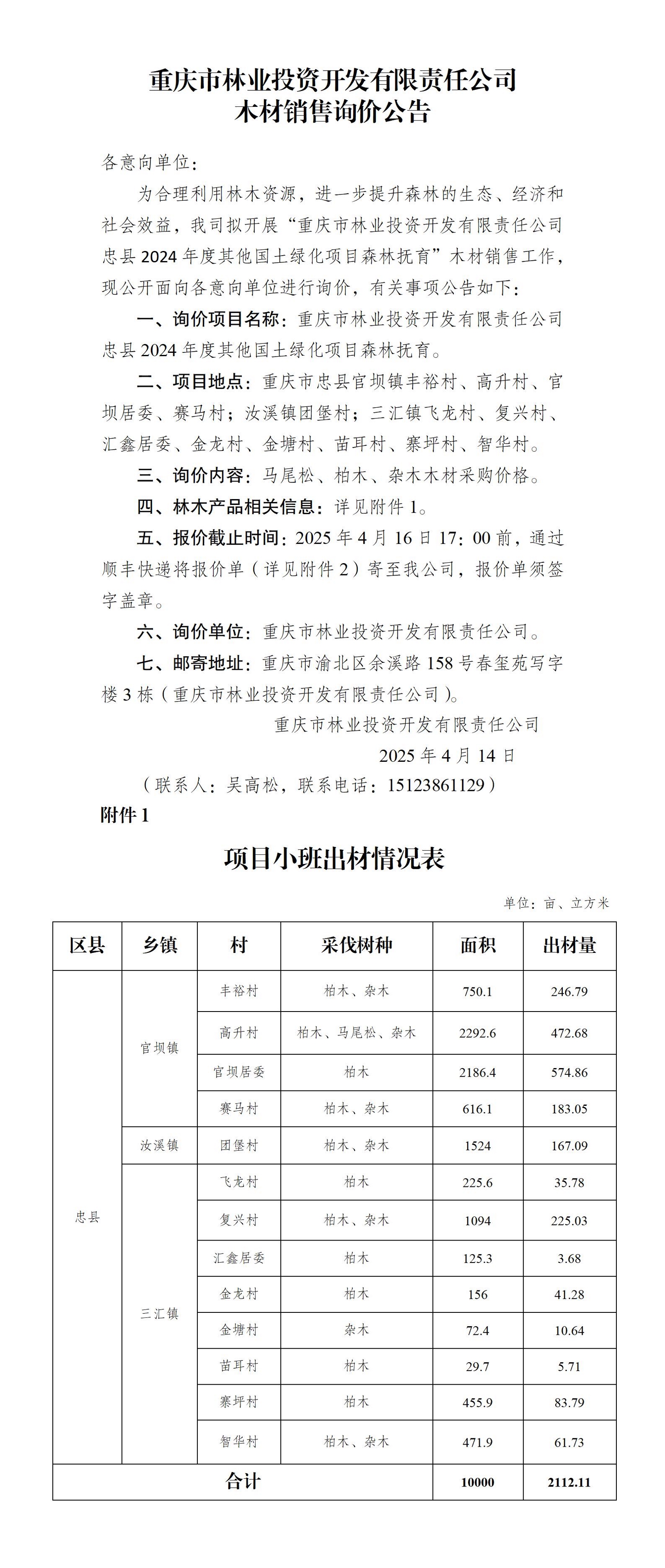 重庆市林业投资开发有限责任公司忠县2024年度其他国土绿化项目森林抚育木材销售询价公告