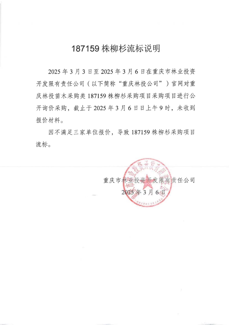 重庆林投苗木采购类187159株柳杉采购项目流标说明