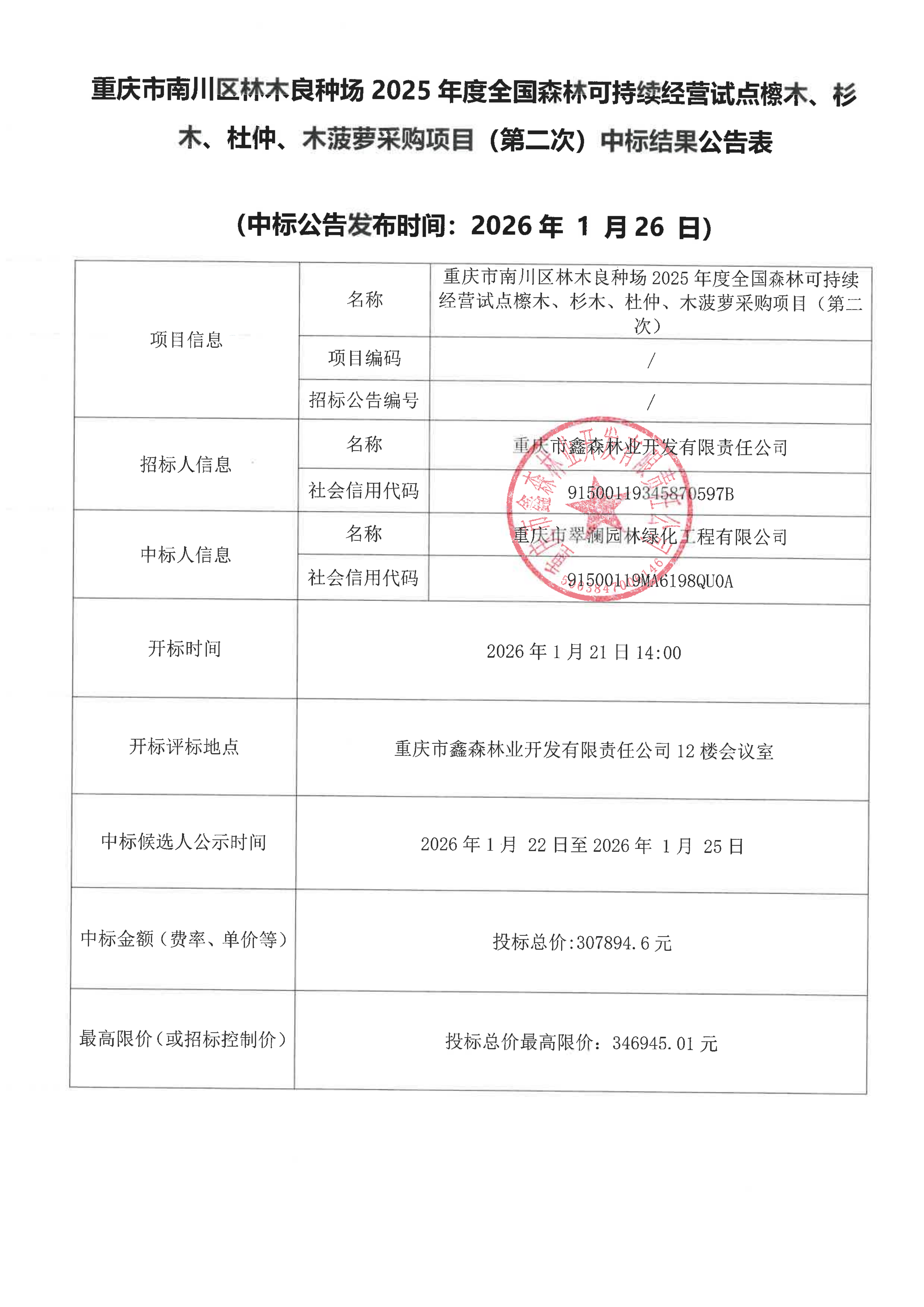重庆市南川区林木良种场2025年度全国森林可持续经营试点檫木、杉木、杜仲、木波罗采购项目(第二次)中标结果公示